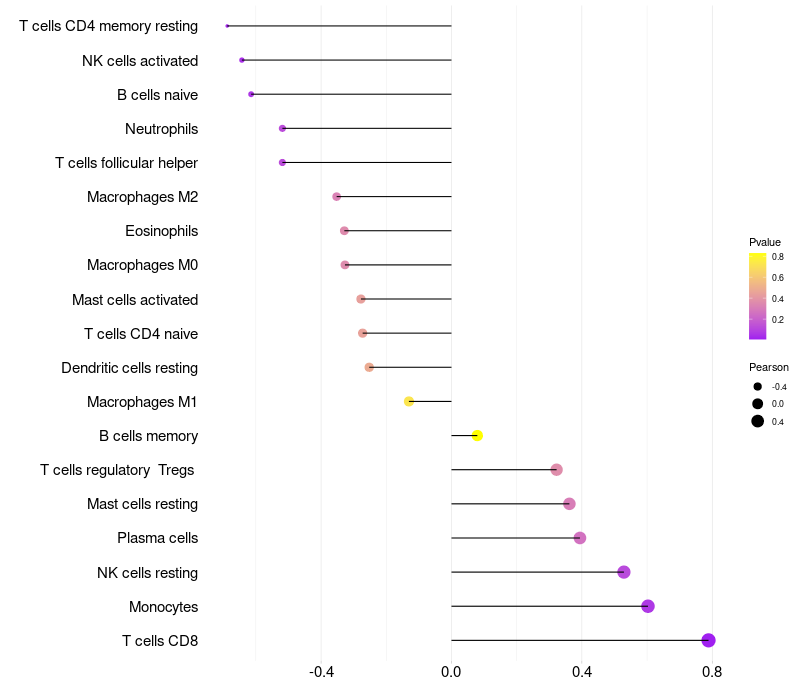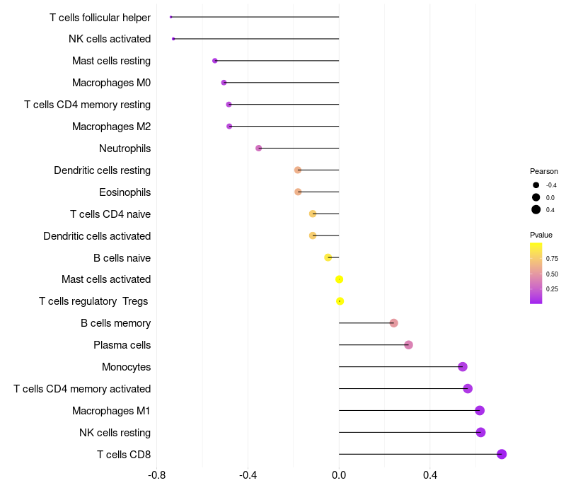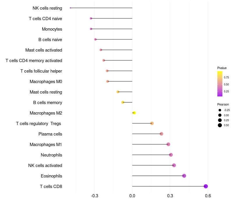 Lollipop of FAT2 expression and immune infiltrating cell level correlation result in HBV+ Liver cirrhosis samples