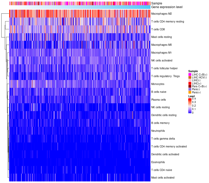 Liver hepatocellular carcinoma HCV (HBV+)(86), Liver hepatocellular carcinoma HCV (HBV-)(19), Liver hepatocellular carcinoma (HBV+)(209), Liver hepatocellular carcinoma (HBV+)(60), Paracancerous HCV (HBV+)(4), Paracancerous (HBV-)(28), Paracancerous (HBV+)(18) |