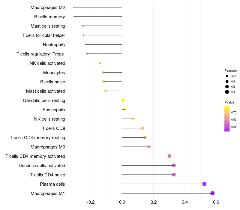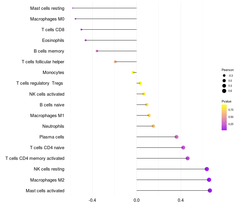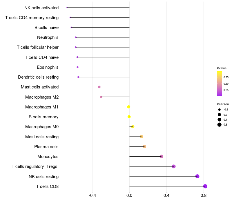Lollipop of FAT3 expression and immune infiltrating cell level correlation result in HBV+ Chronic HBV (CHB) infection samples
