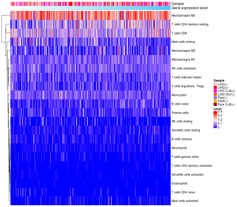 Liver hepatocellular carcinoma HCV (HBV+)(86), Liver hepatocellular carcinoma HCV (HBV-)(19), Liver hepatocellular carcinoma (HBV+)(209), Liver hepatocellular carcinoma (HBV+)(60), Paracancerous HCV (HBV+)(4), Paracancerous (HBV-)(28), Paracancerous (HBV+)(18) |