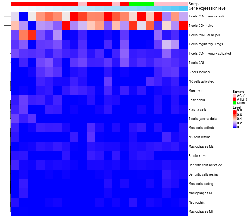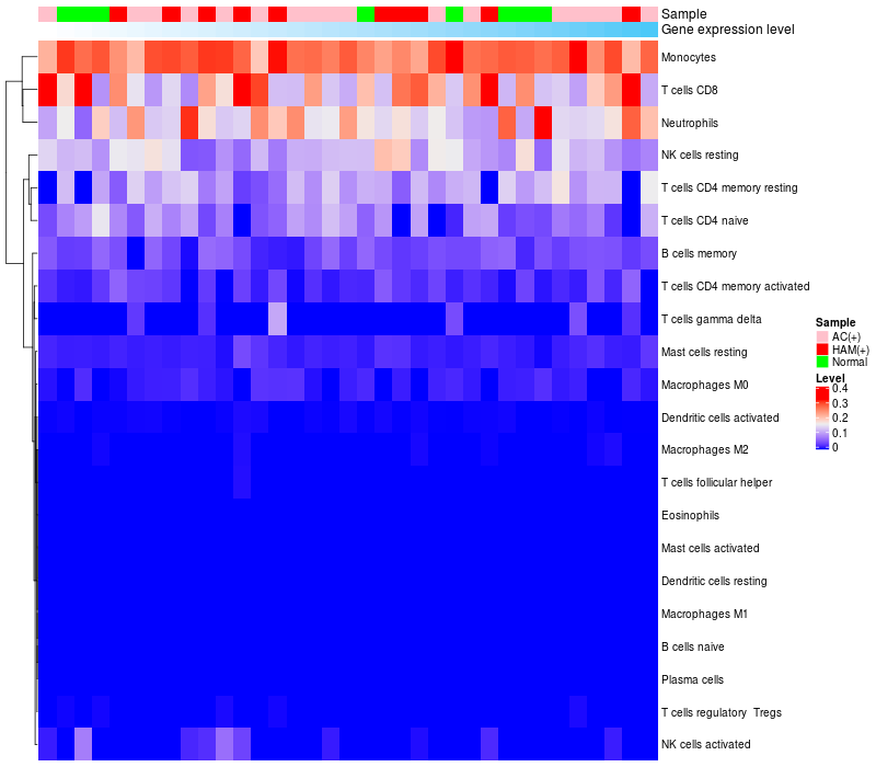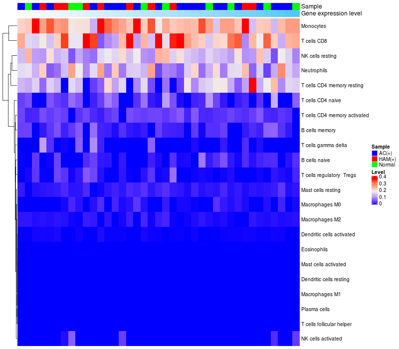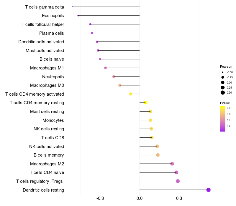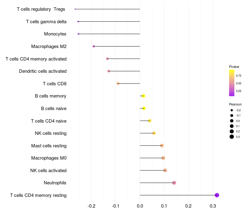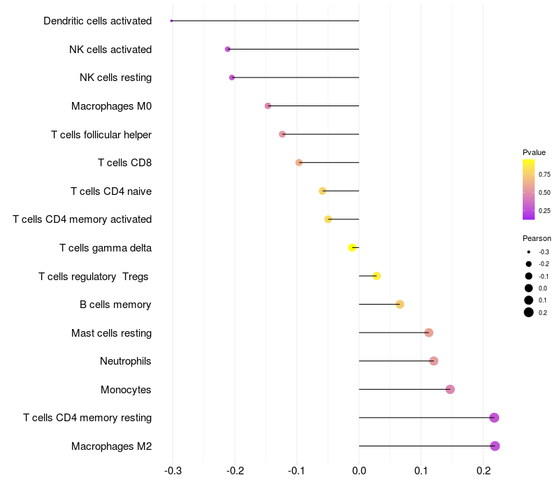 Lollipop of FBF1 expression and immune infiltrating cell level correlation result in HTLV1+ samples