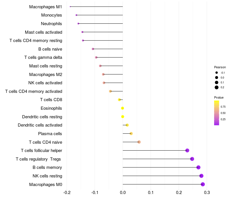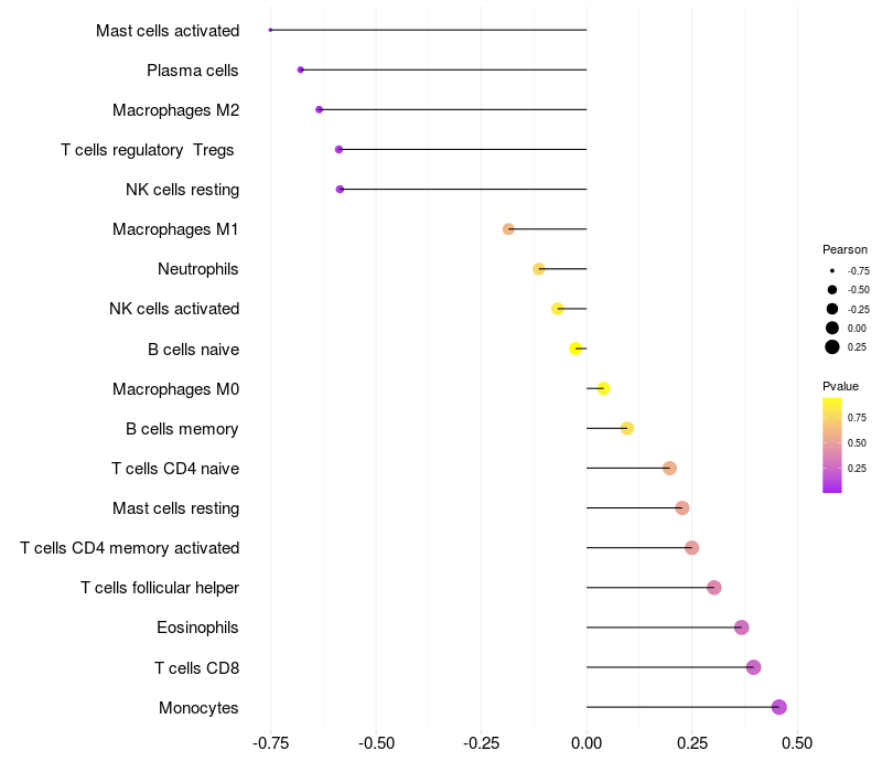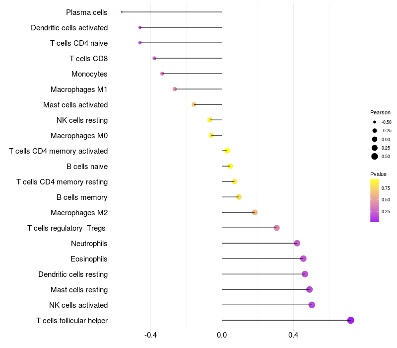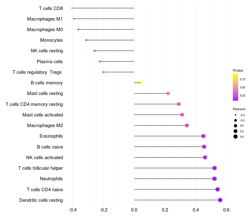 Lollipop of FBL expression and immune infiltrating cell level correlation result in HBV+ Liver cirrhosis samples