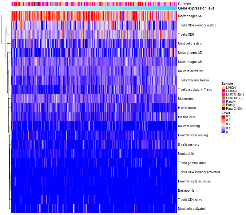 Liver hepatocellular carcinoma HCV (HBV+)(86), Liver hepatocellular carcinoma HCV (HBV-)(19), Liver hepatocellular carcinoma (HBV+)(209), Liver hepatocellular carcinoma (HBV+)(60), Paracancerous HCV (HBV+)(4), Paracancerous (HBV-)(28), Paracancerous (HBV+)(18) |