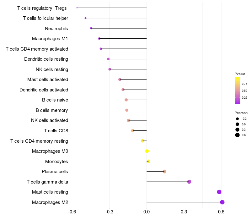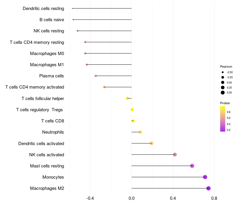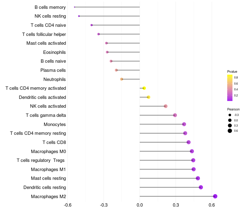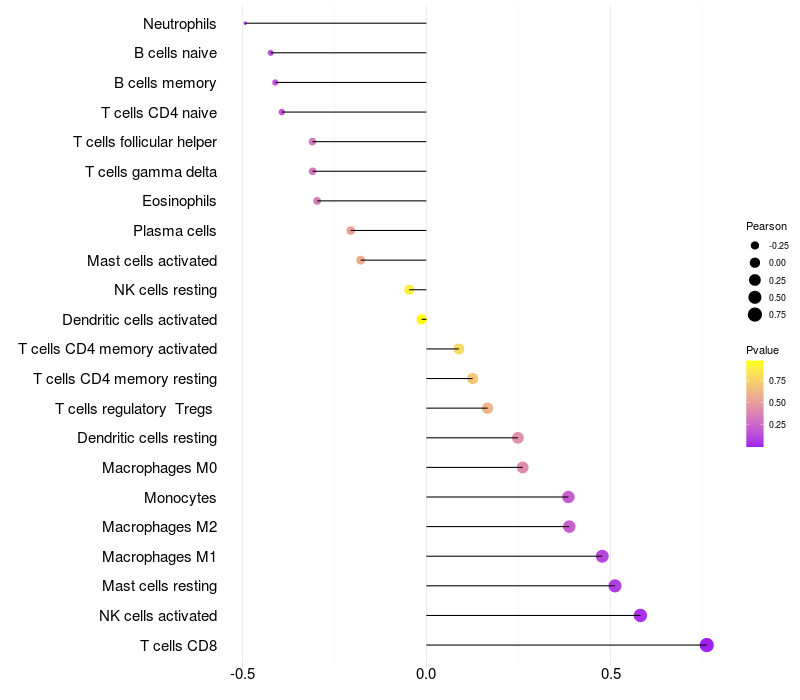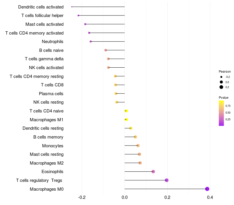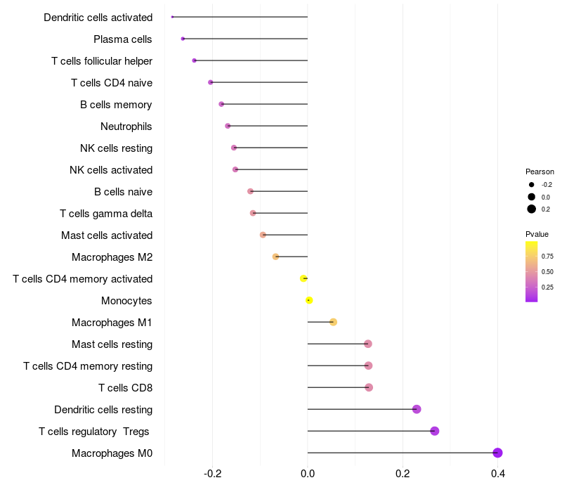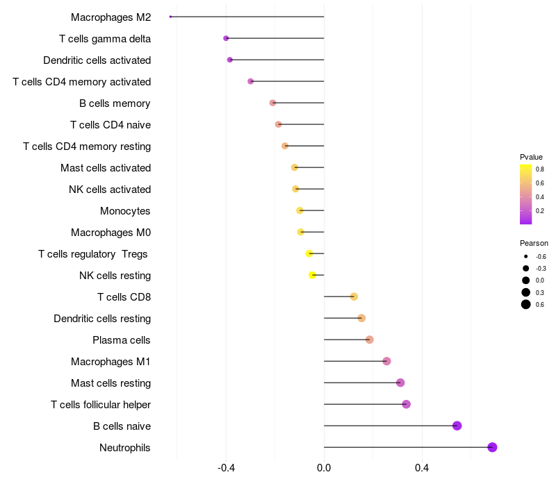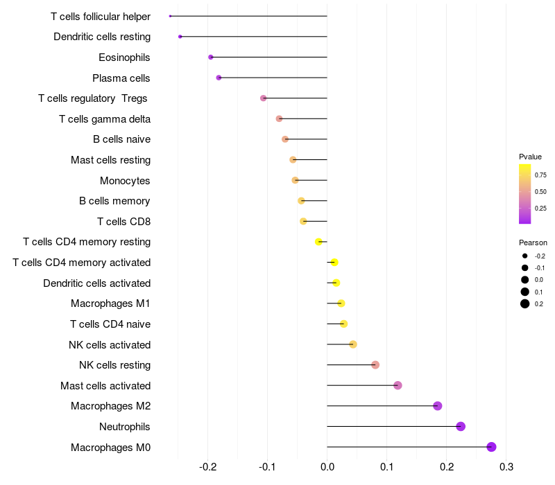 Lollipop of FBLN2 expression and immune infiltrating cell level correlation result in HPV+ samples