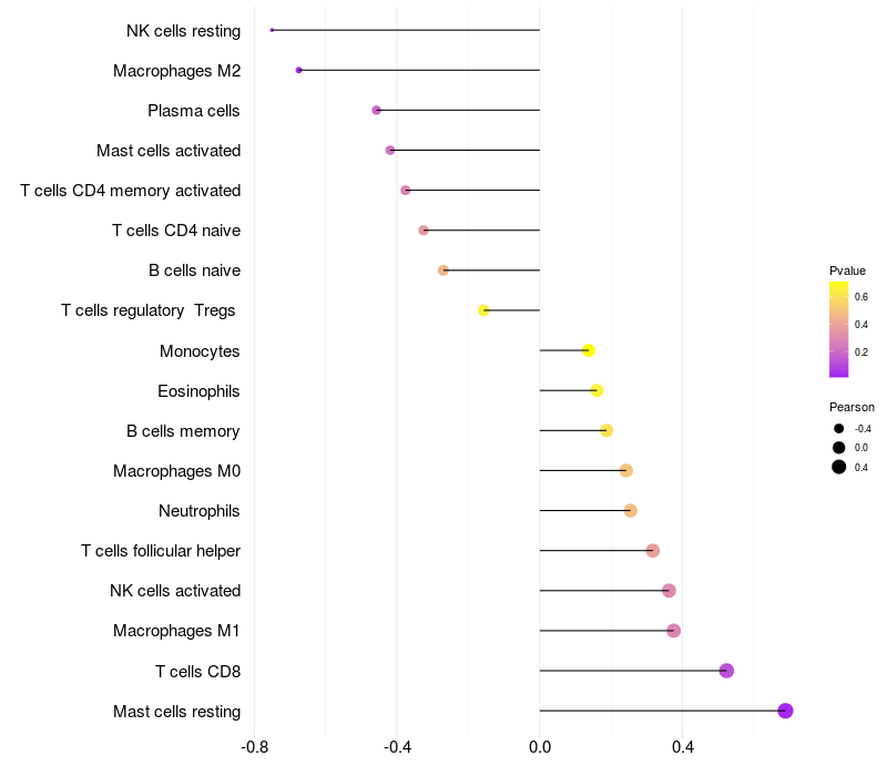 Lollipop of FBXO42 expression and immune infiltrating cell level correlation result in HBV+ Chronic HBV (CHB) infection samples