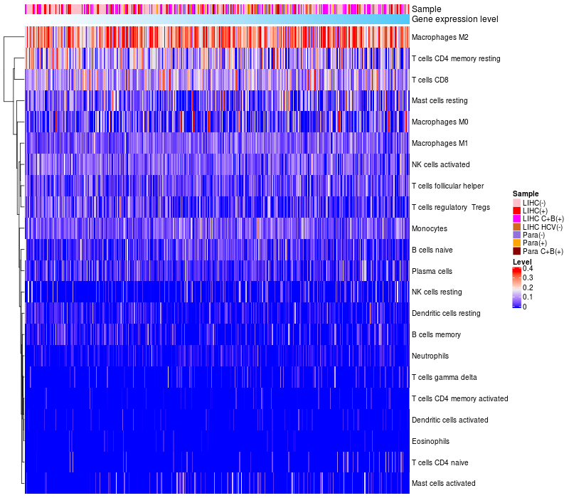 Liver hepatocellular carcinoma HCV (HBV+)(86), Liver hepatocellular carcinoma HCV (HBV-)(19), Liver hepatocellular carcinoma (HBV+)(209), Liver hepatocellular carcinoma (HBV+)(60), Paracancerous HCV (HBV+)(4), Paracancerous (HBV-)(28), Paracancerous (HBV+)(18) |