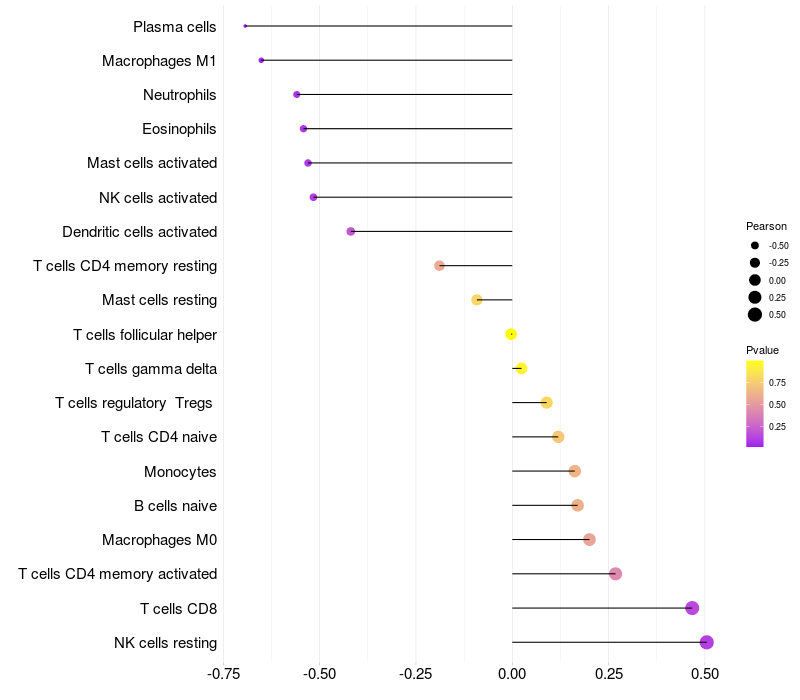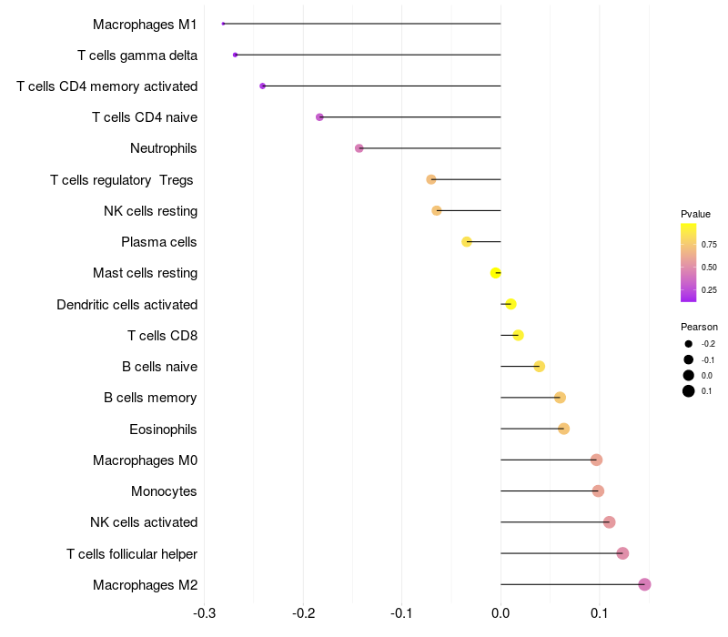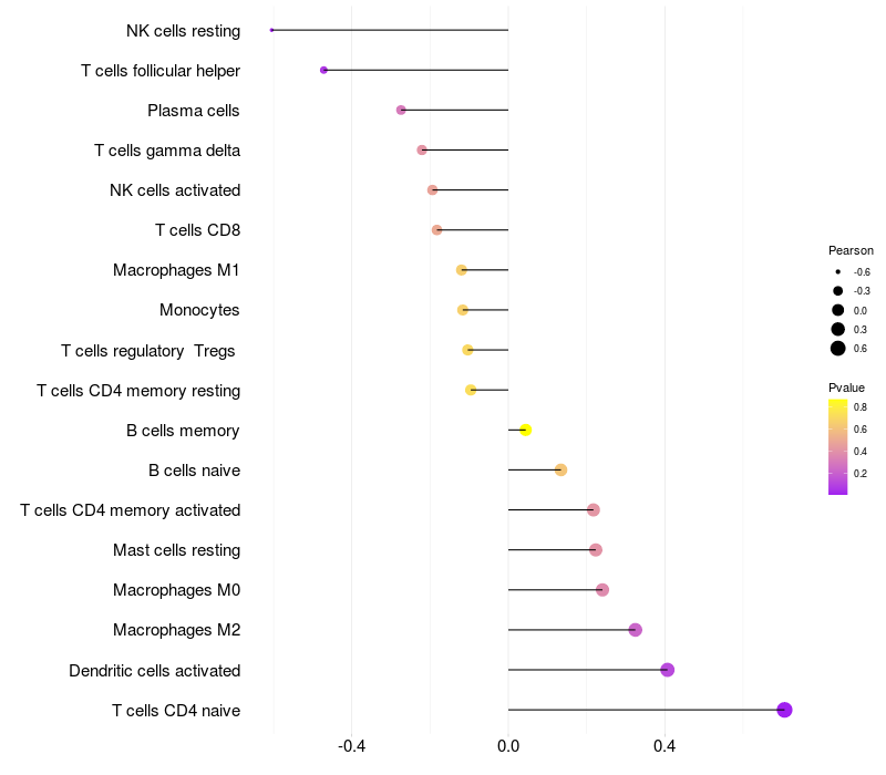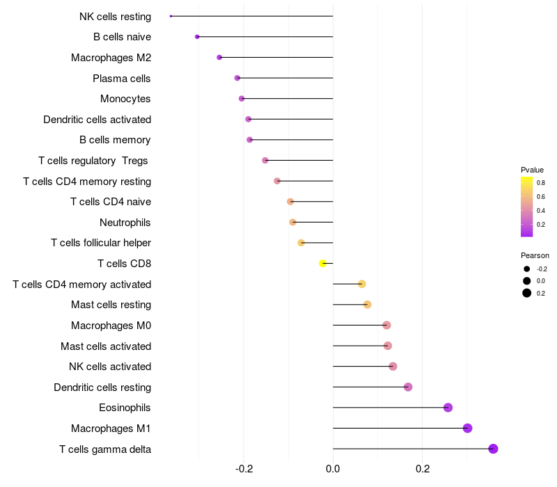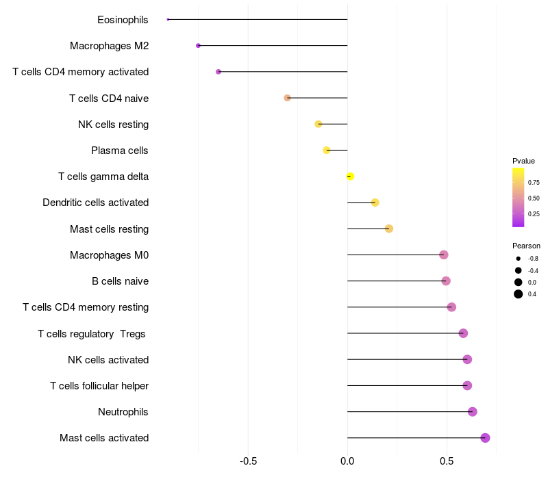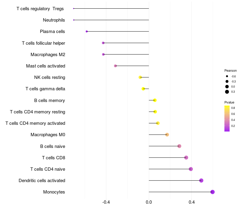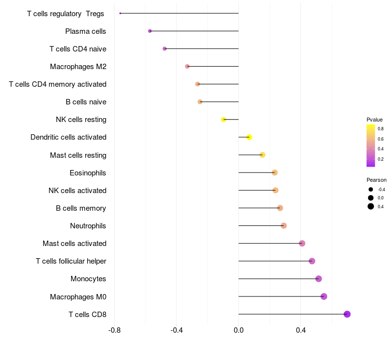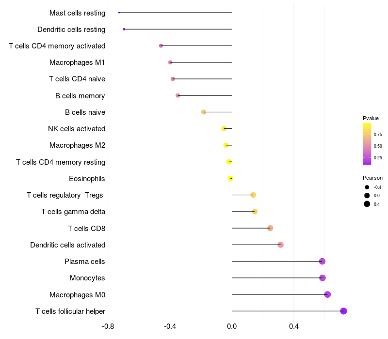 Lollipop of FCGBP expression and immune infiltrating cell level correlation result in EBV+ samples