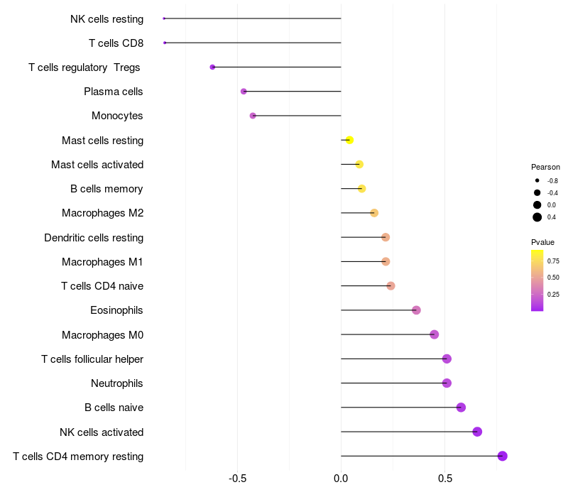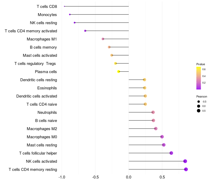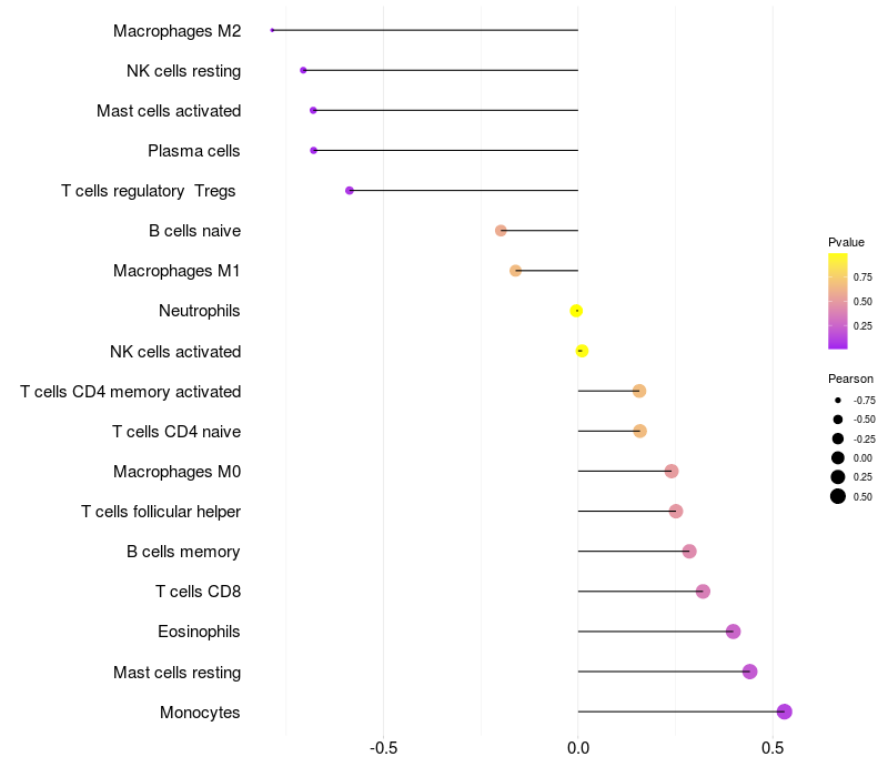 Lollipop of FDFT1 expression and immune infiltrating cell level correlation result in HBV+ Liver cirrhosis samples