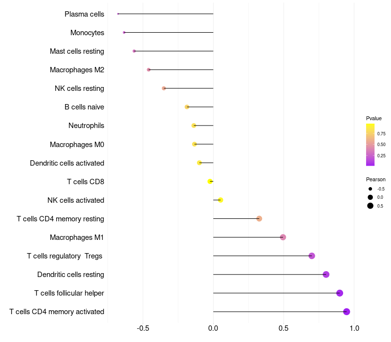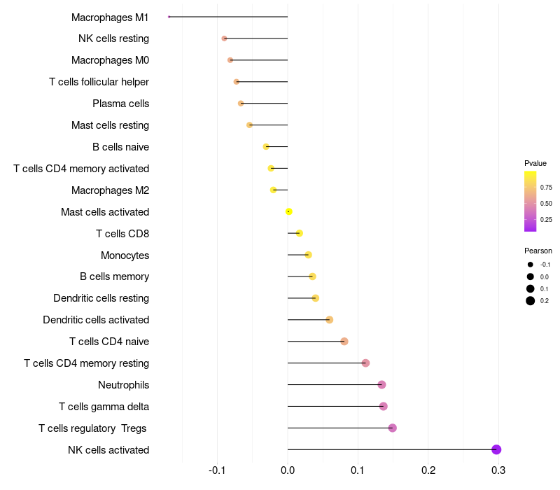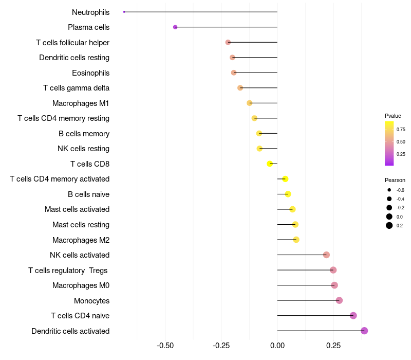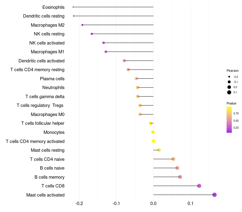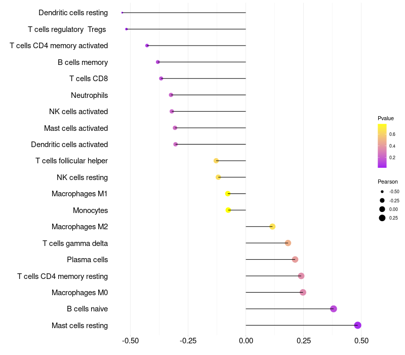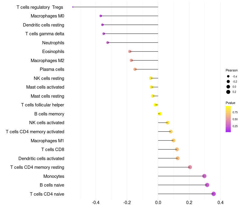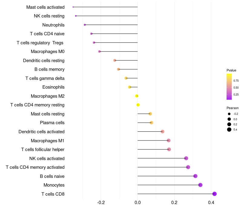 Lollipop of FER1L5 expression and immune infiltrating cell level correlation result in HPV+ samples
