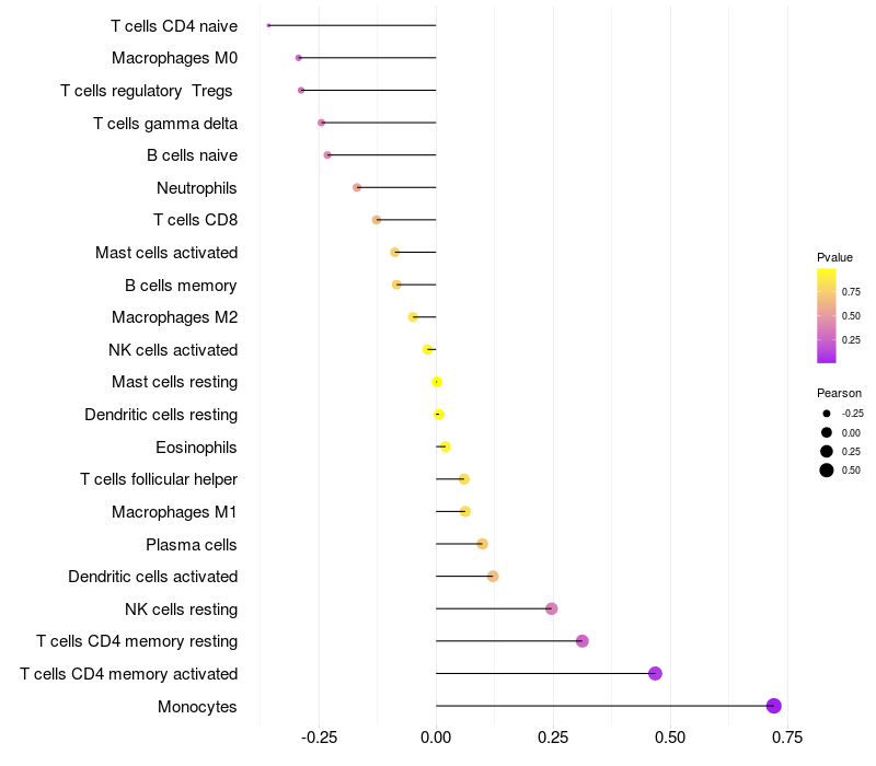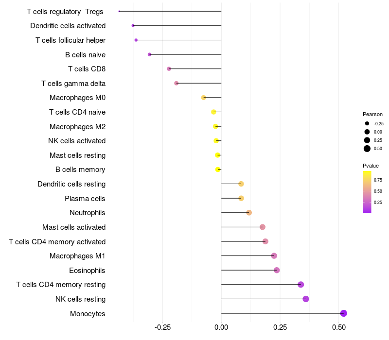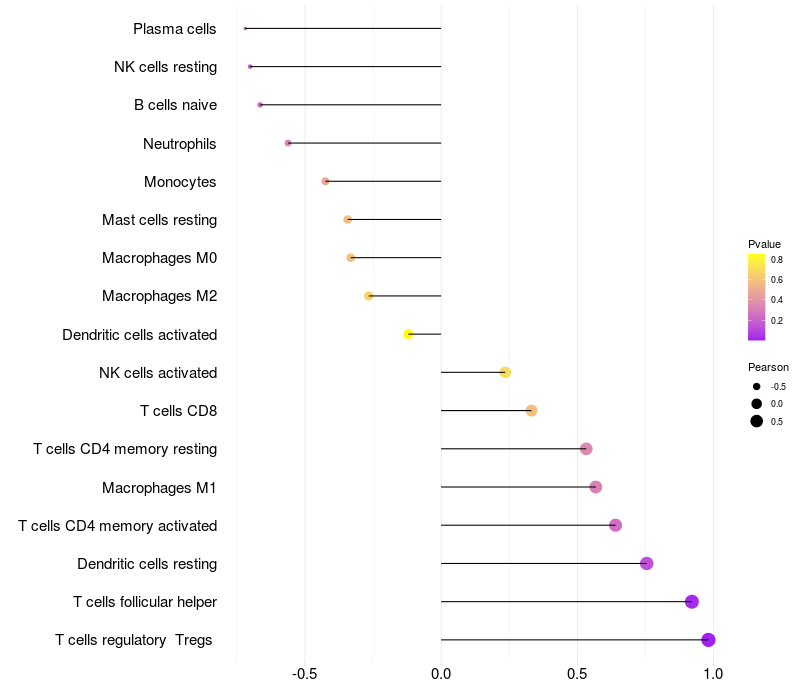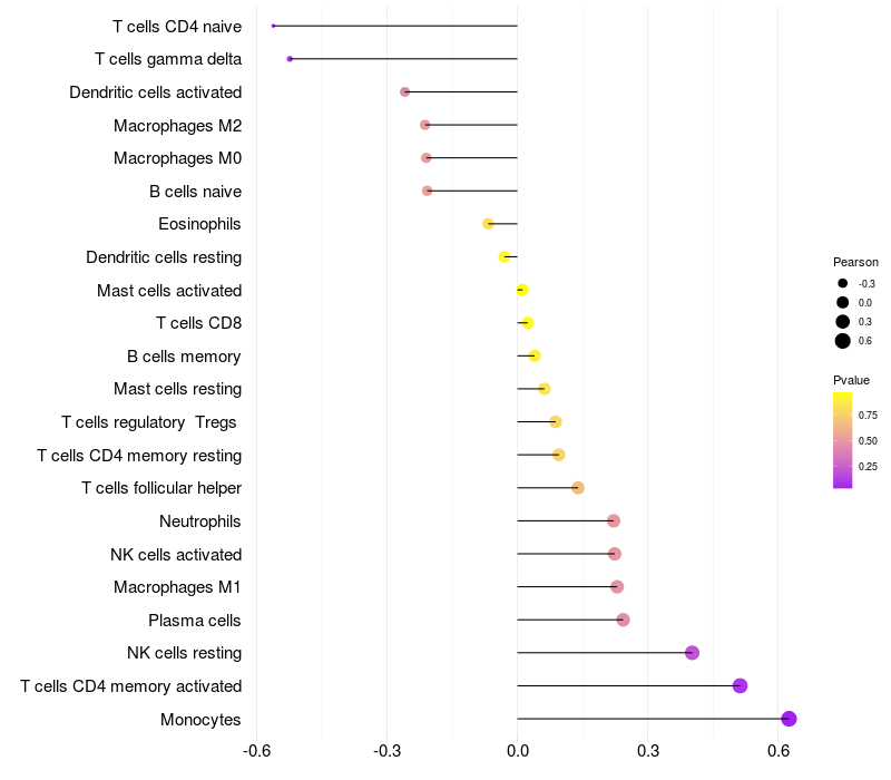 Lollipop of FER1L6-AS1 expression and immune infiltrating cell level correlation result in HPV+ samples
