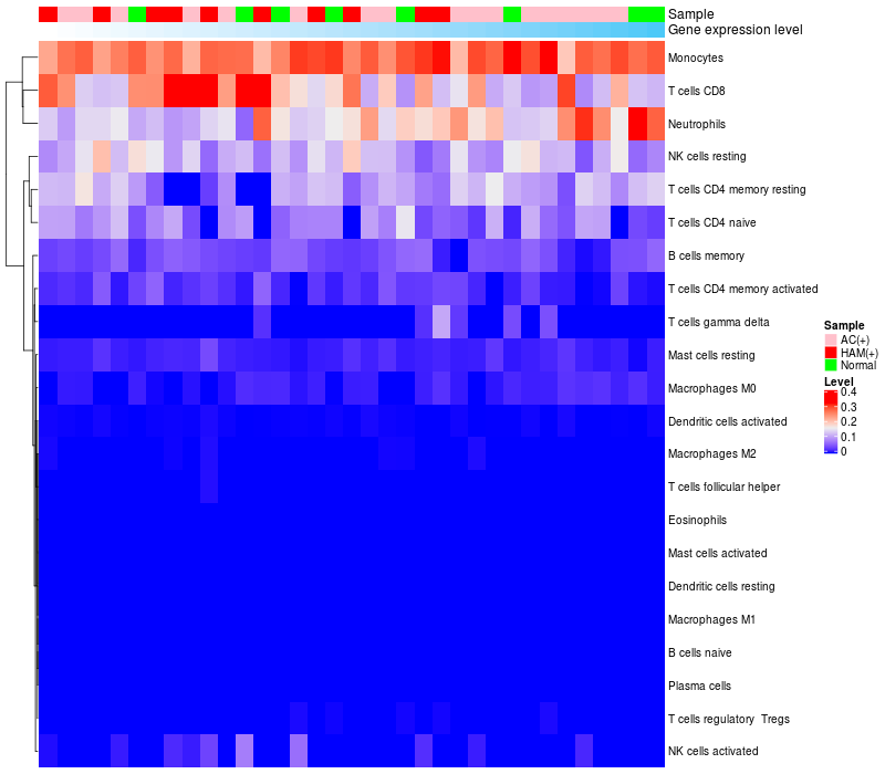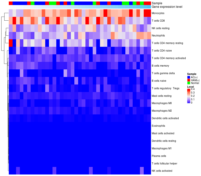 Normal (8), Asymptomatic carriers (HTLV1+)(17), HTLV-1-associated myelopathy (HTLV1+)(10) |