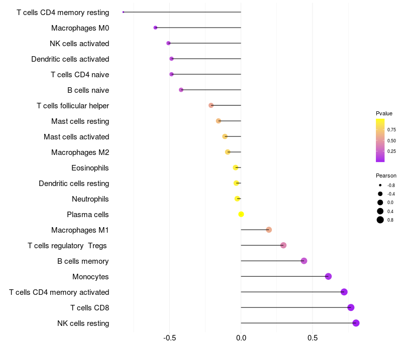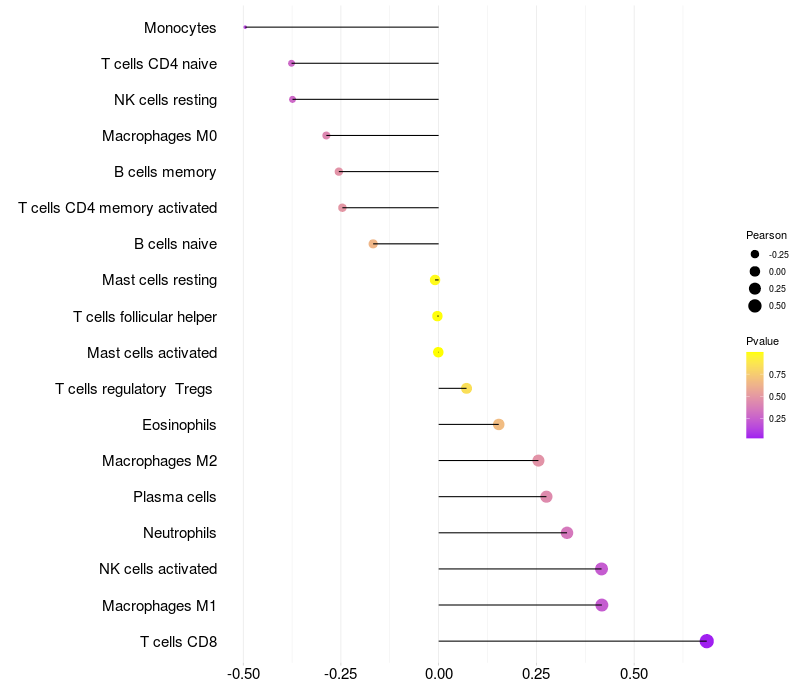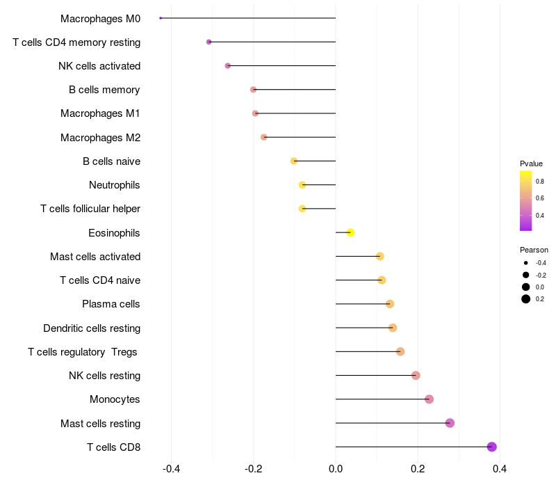 Lollipop of FGB expression and immune infiltrating cell level correlation result in HBV+ Chronic HBV (CHB) infection samples