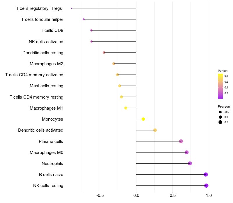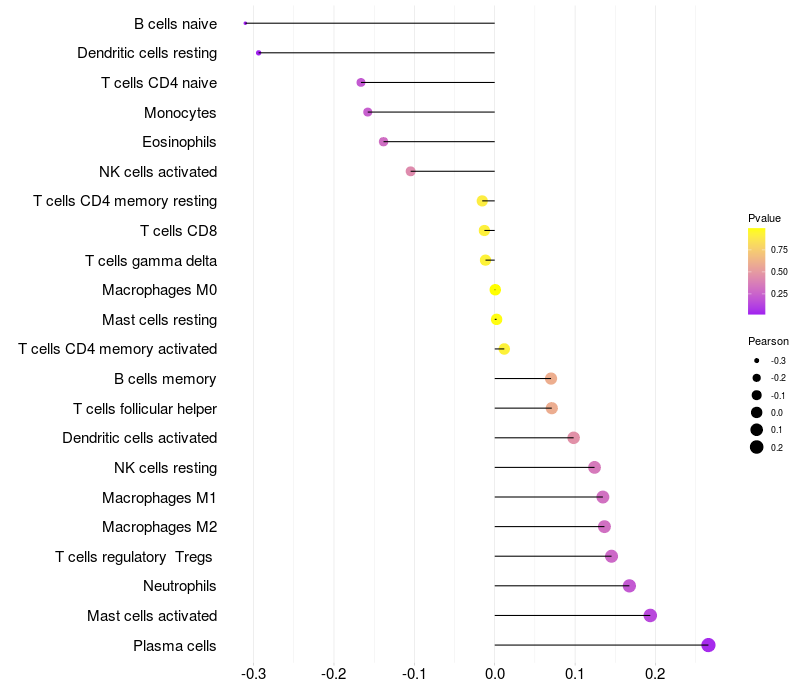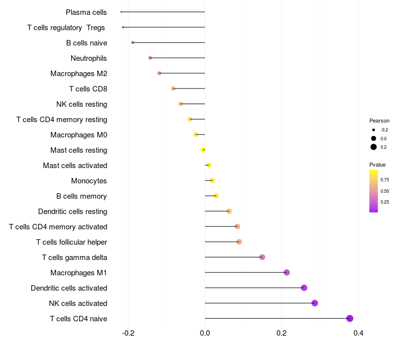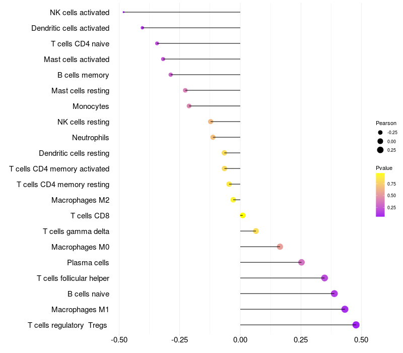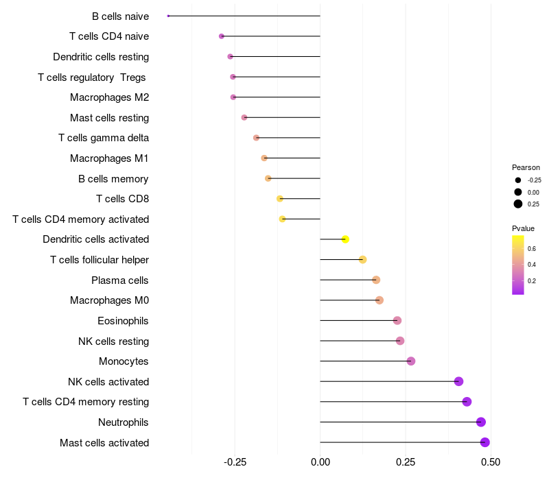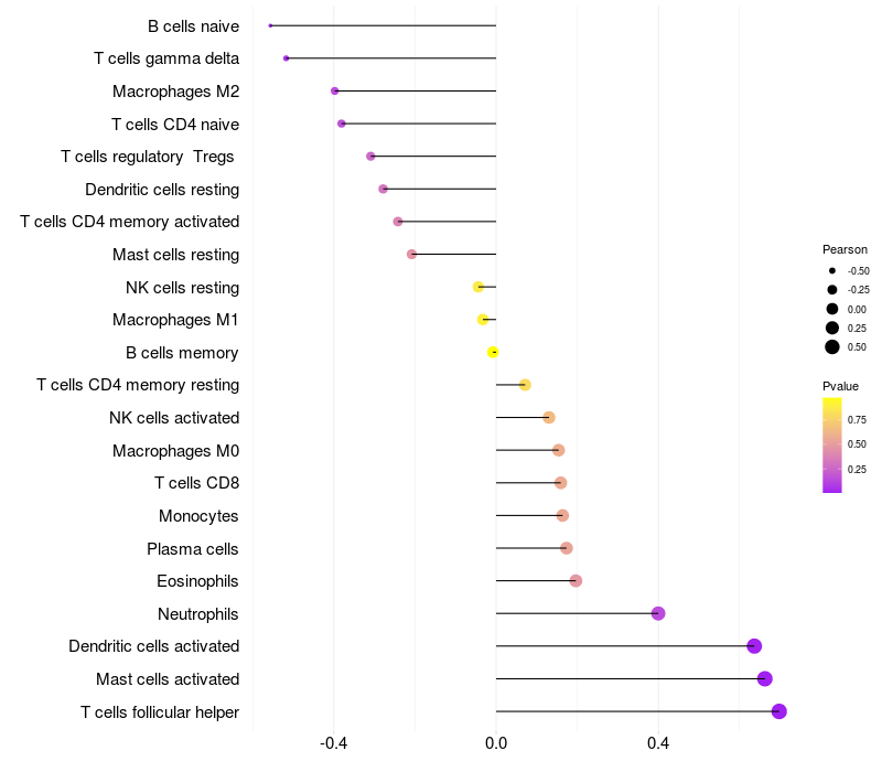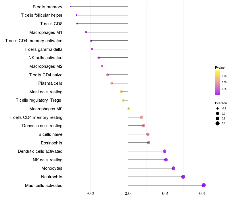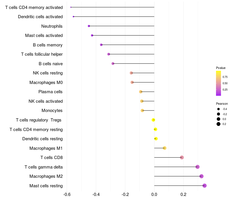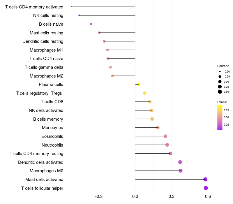 Lollipop of FGD1 expression and immune infiltrating cell level correlation result in HPV+ samples