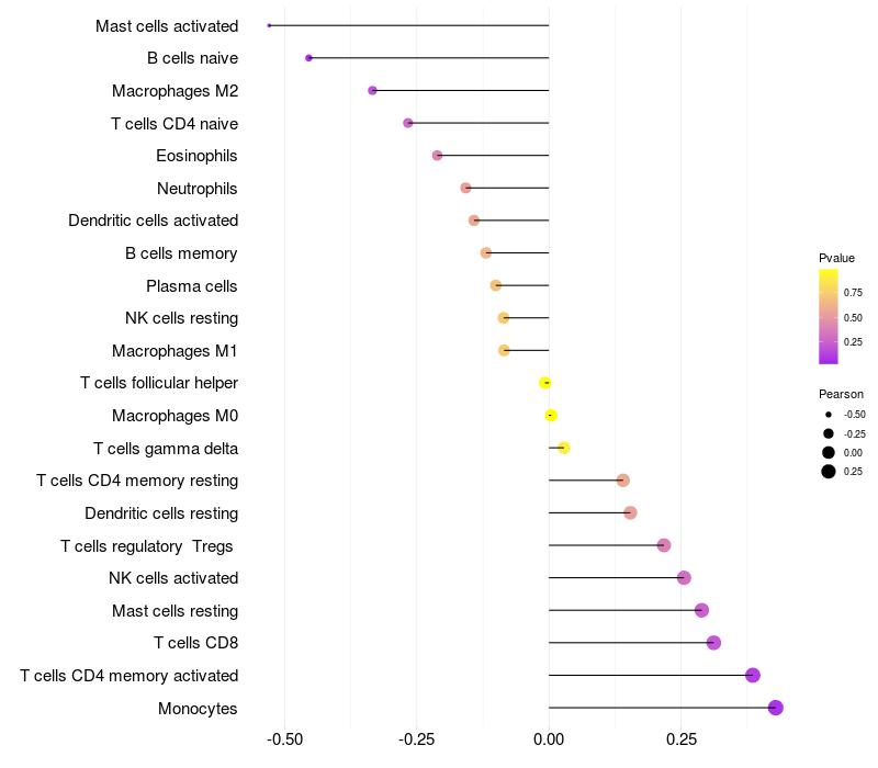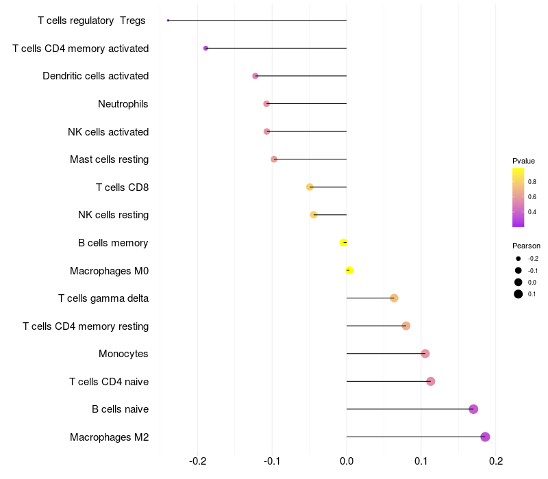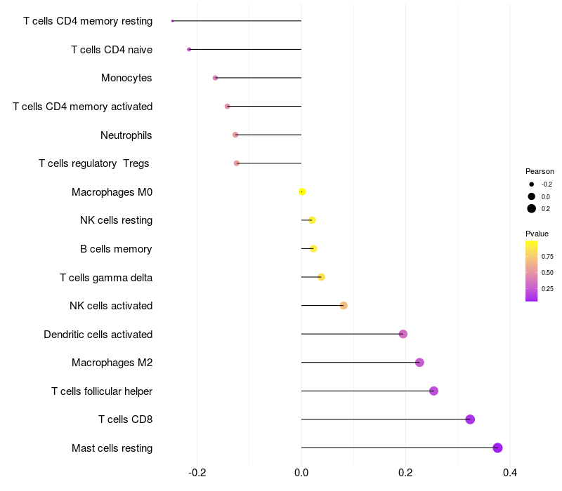 Lollipop of FGF1 expression and immune infiltrating cell level correlation result in HTLV1+ samples
