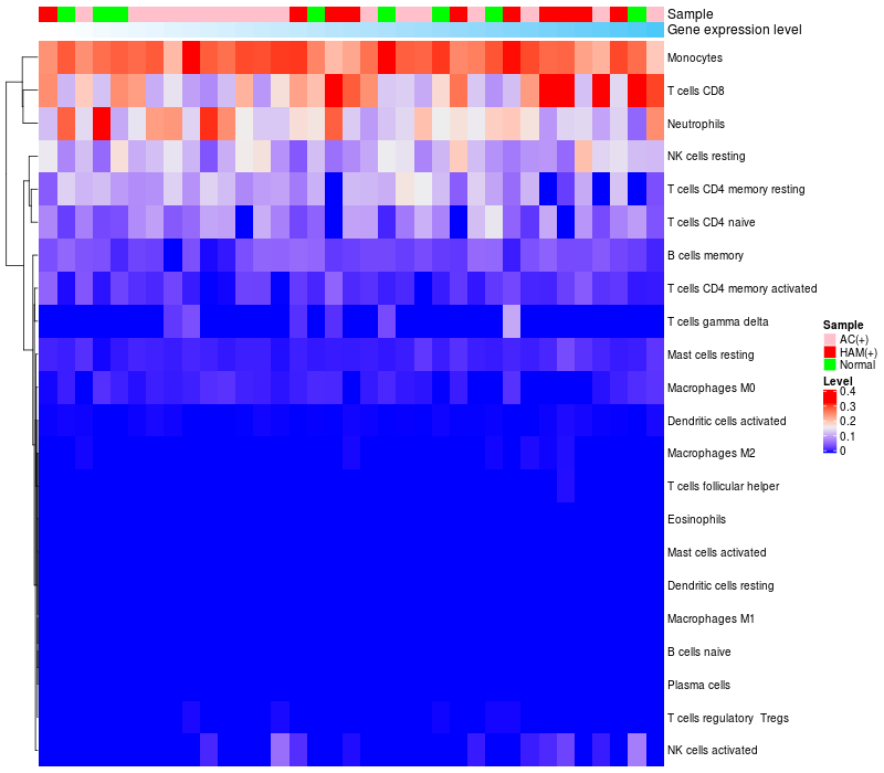 Normal (8), Asymptomatic carriers (HTLV1+)(17), HTLV-1-associated myelopathy (HTLV1+)(10) |