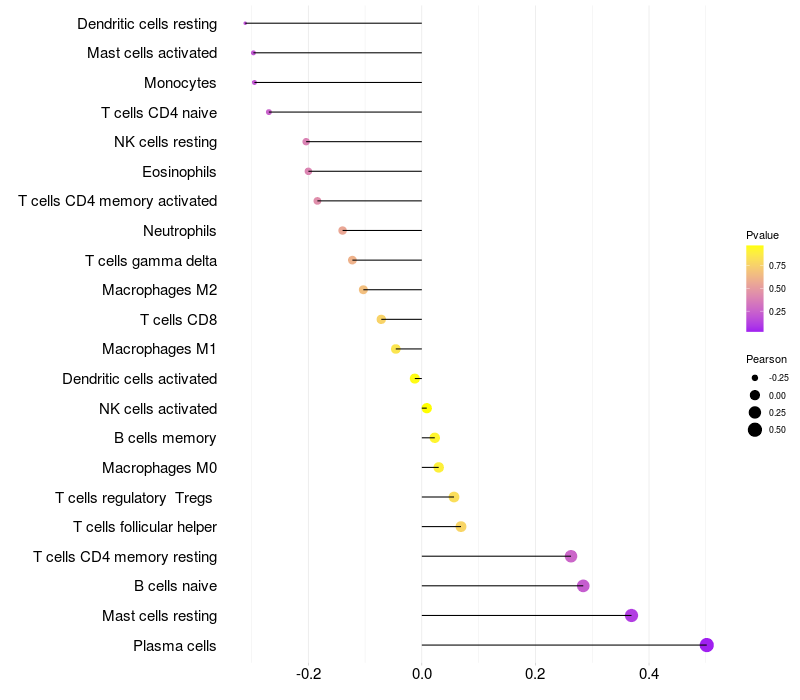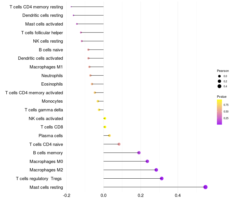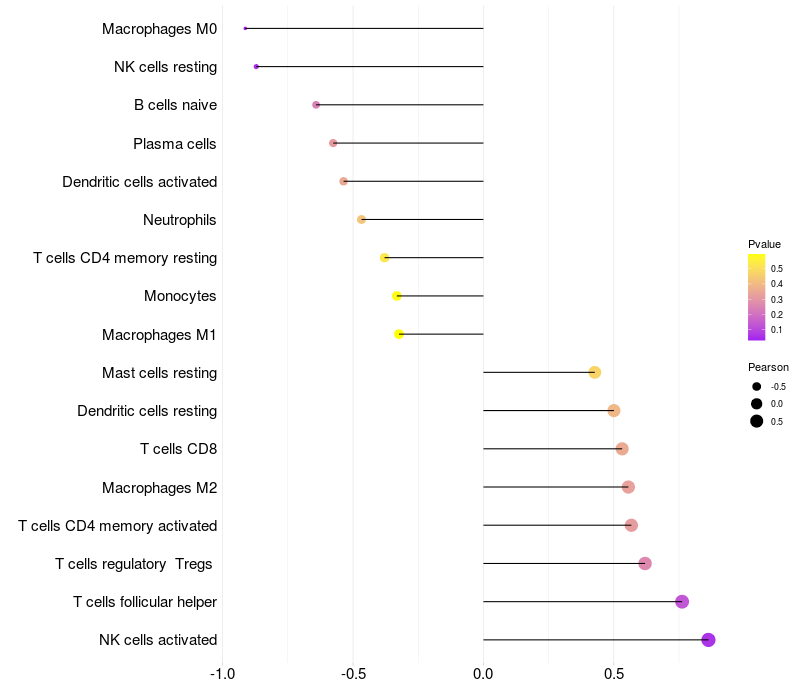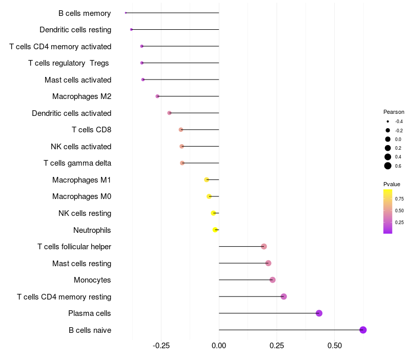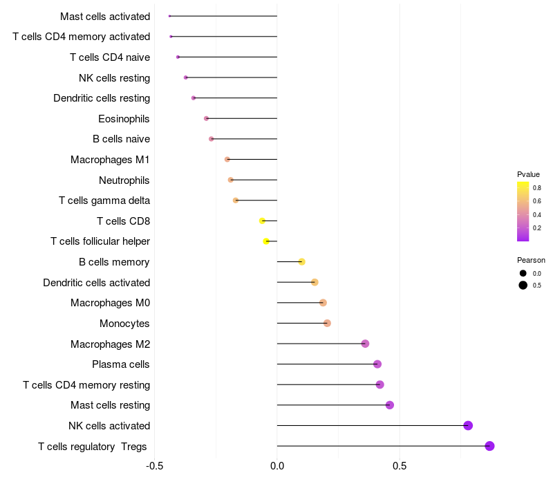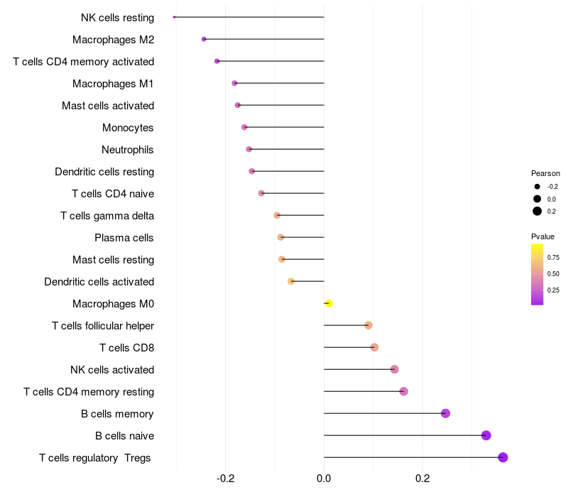 Lollipop of FGF20 expression and immune infiltrating cell level correlation result in HPV+ samples