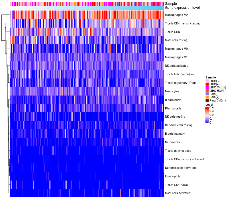 Liver hepatocellular carcinoma HCV (HBV+)(86), Liver hepatocellular carcinoma HCV (HBV-)(19), Liver hepatocellular carcinoma (HBV+)(209), Liver hepatocellular carcinoma (HBV+)(60), Paracancerous HCV (HBV+)(4), Paracancerous (HBV-)(28), Paracancerous (HBV+)(18) |