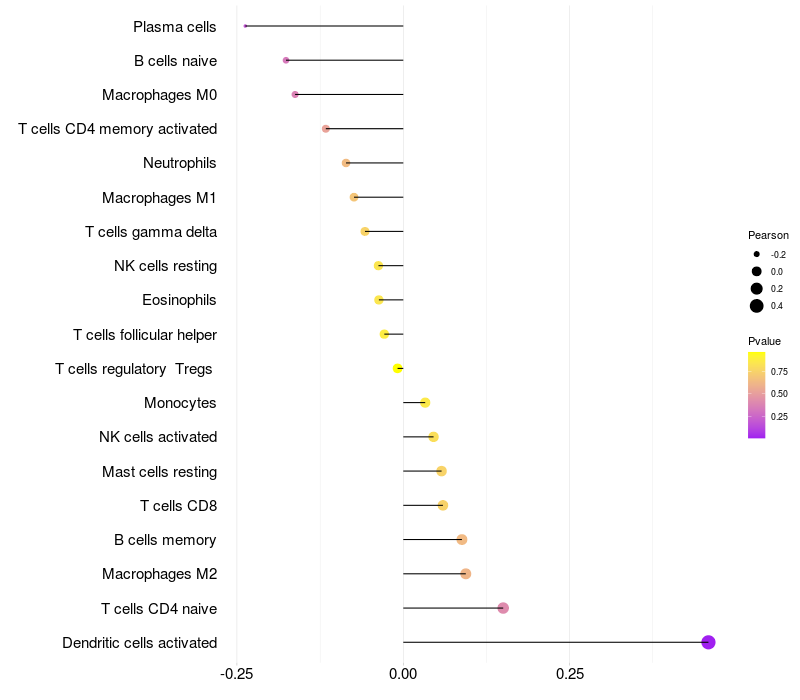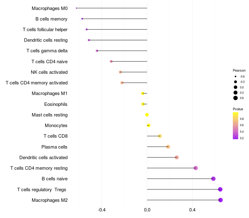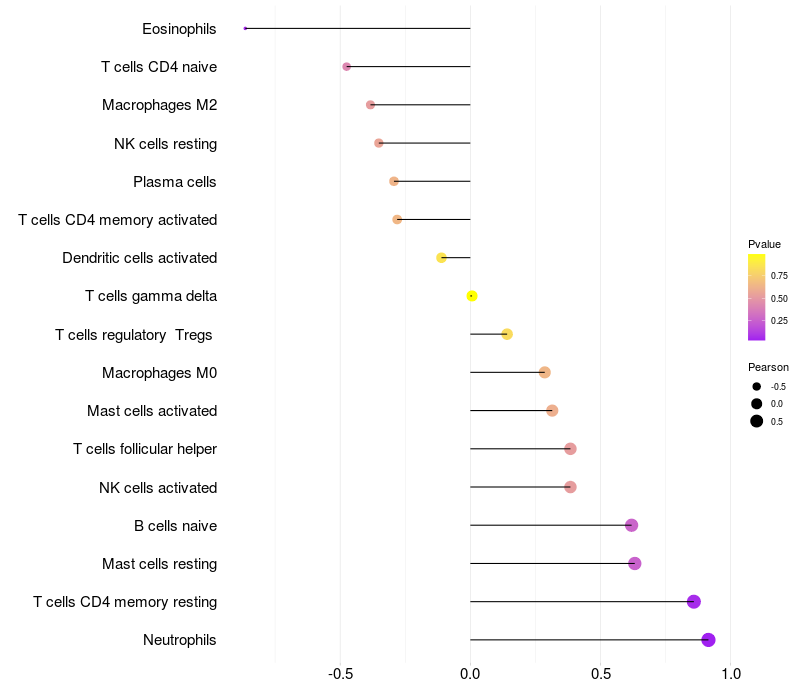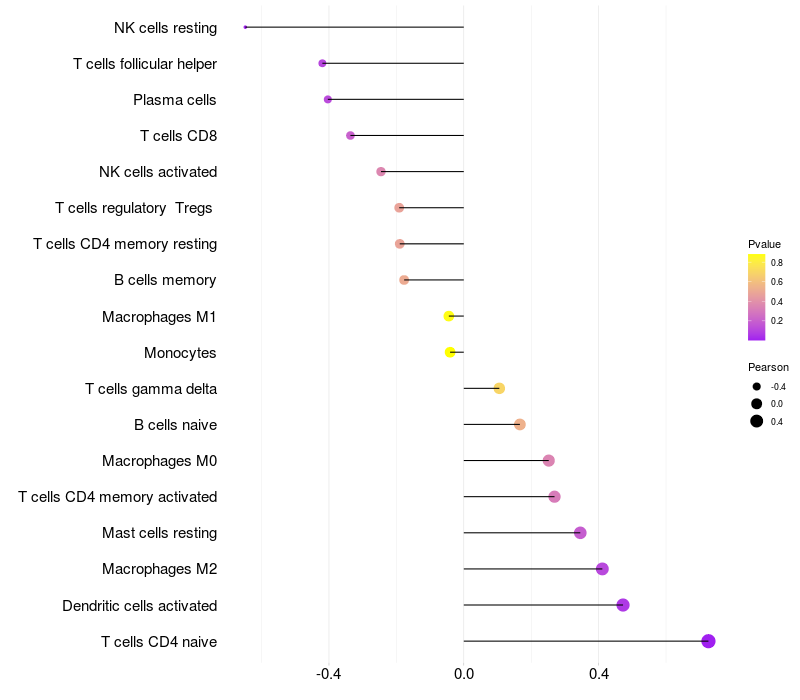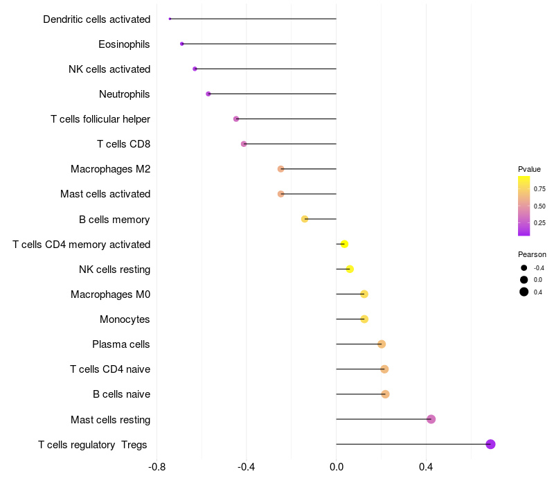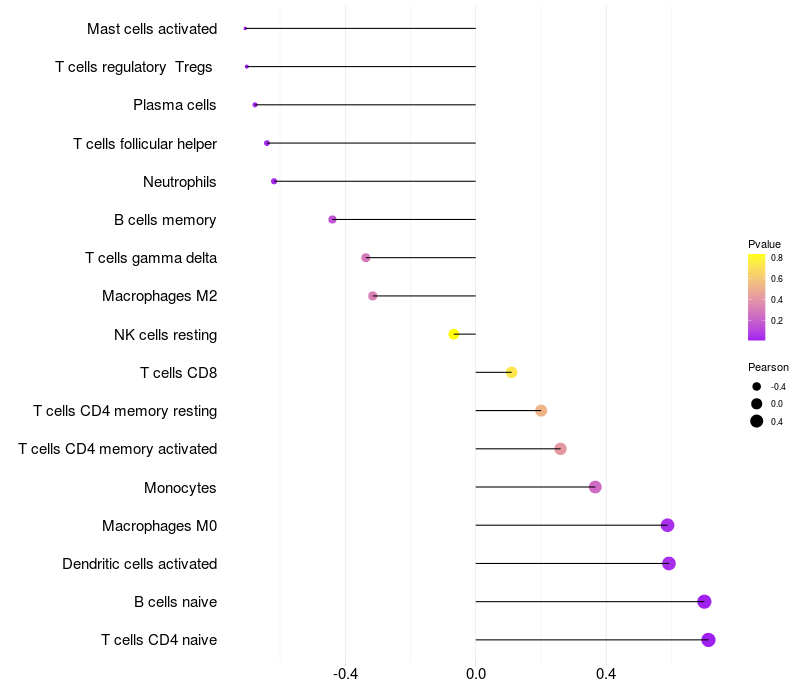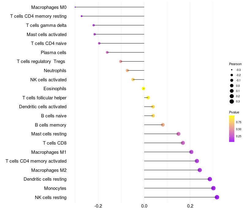Lollipop of FHIT expression and immune infiltrating cell level correlation result in EBV+ samples