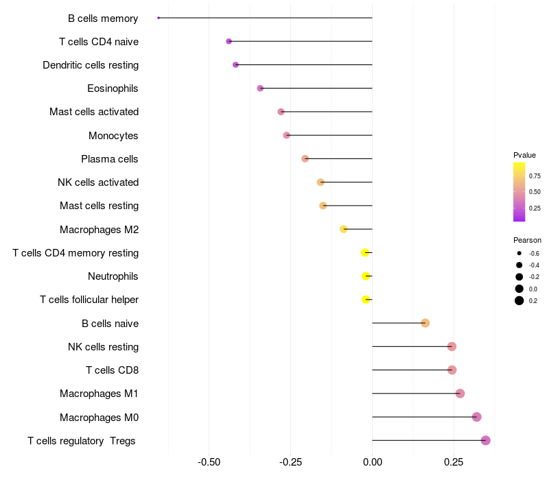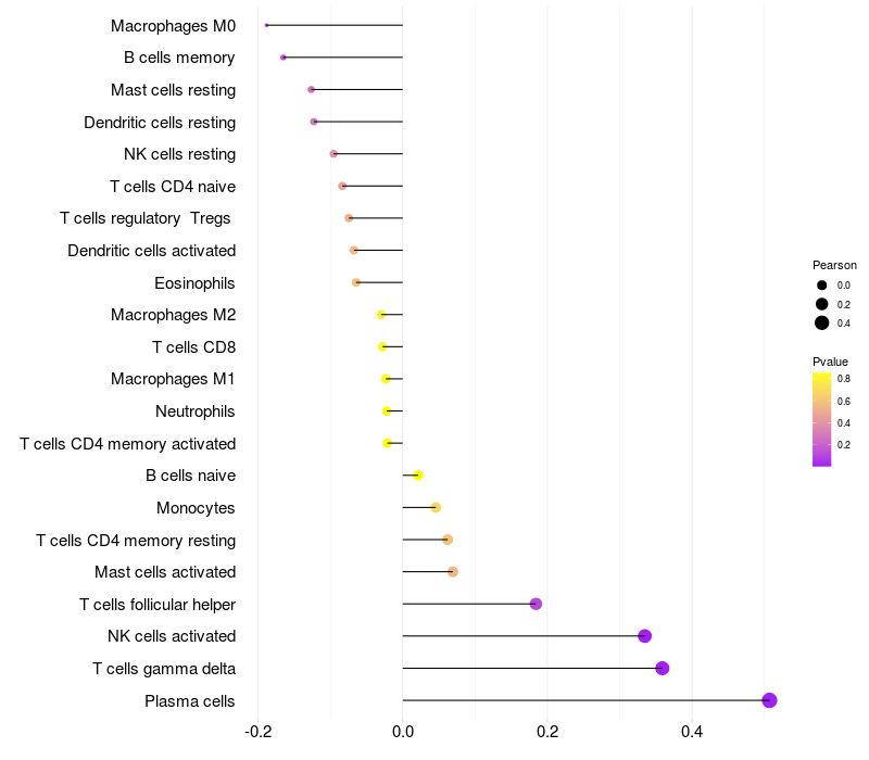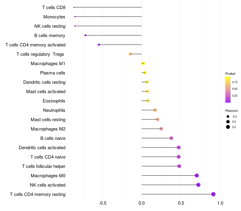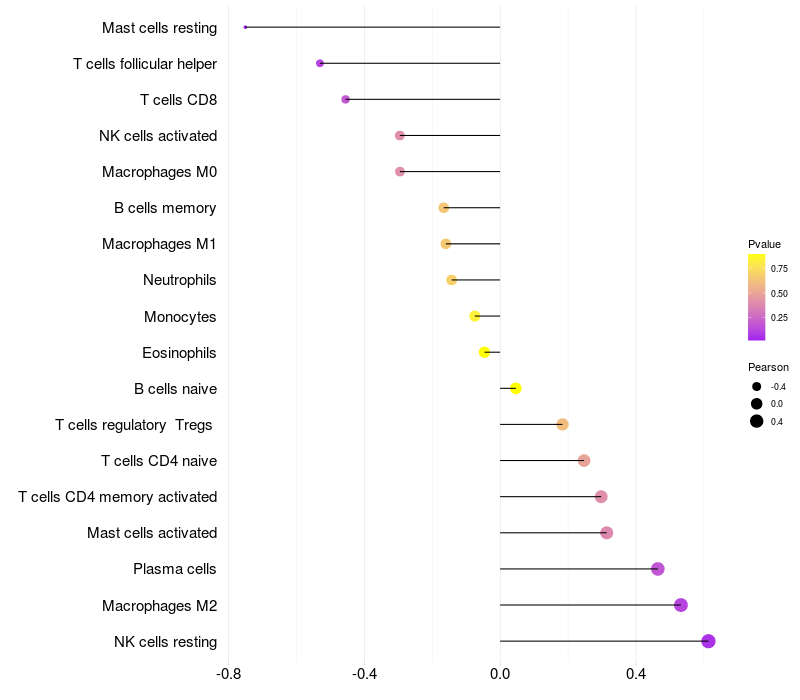 Lollipop of FHL1 expression and immune infiltrating cell level correlation result in HBV+ samples