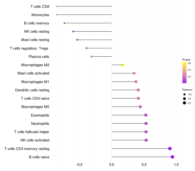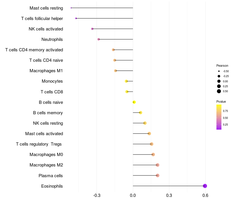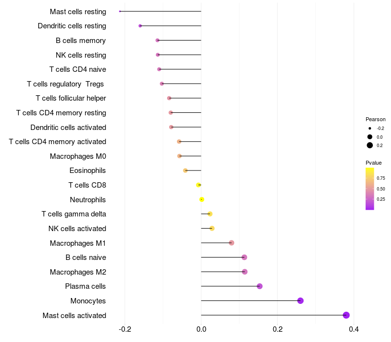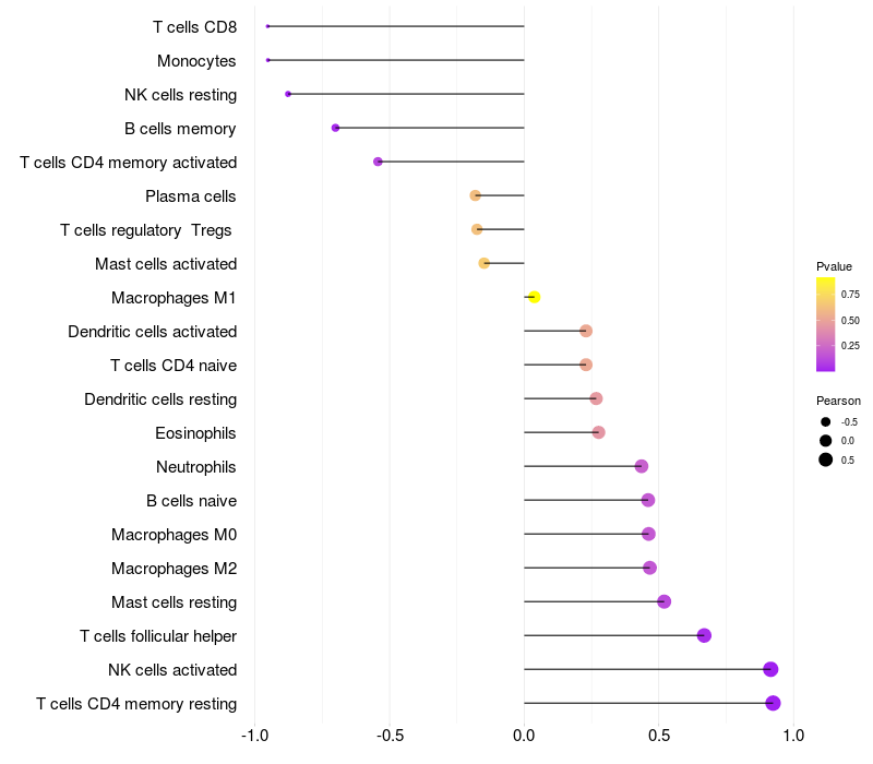 Lollipop of FHL2 expression and immune infiltrating cell level correlation result in HBV+ samples