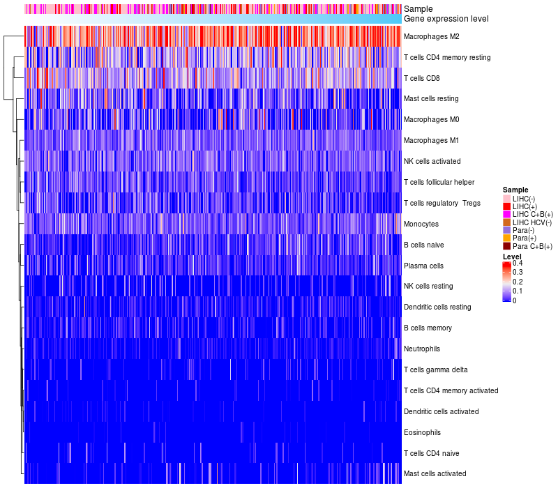 Liver hepatocellular carcinoma HCV (HBV+)(86), Liver hepatocellular carcinoma HCV (HBV-)(19), Liver hepatocellular carcinoma (HBV+)(209), Liver hepatocellular carcinoma (HBV+)(60), Paracancerous HCV (HBV+)(4), Paracancerous (HBV-)(28), Paracancerous (HBV+)(18) |