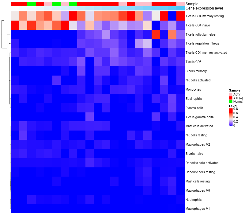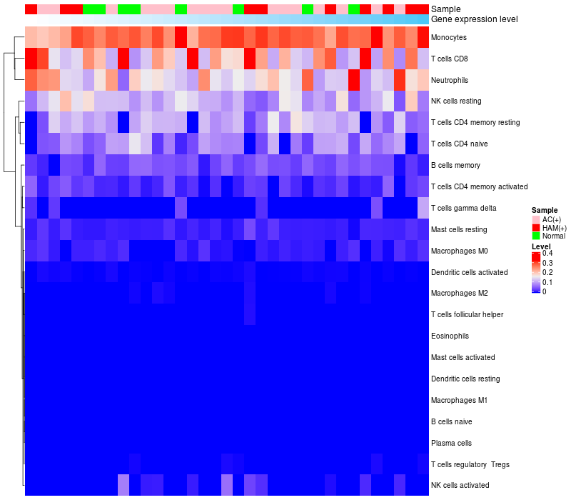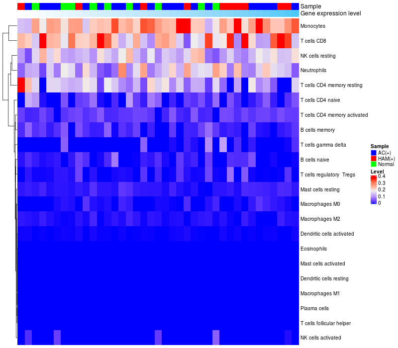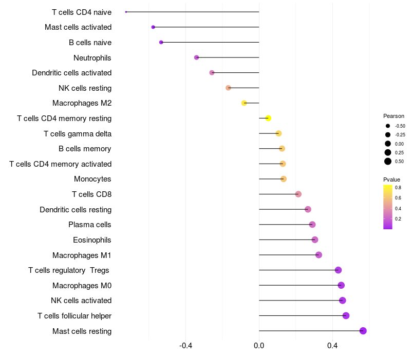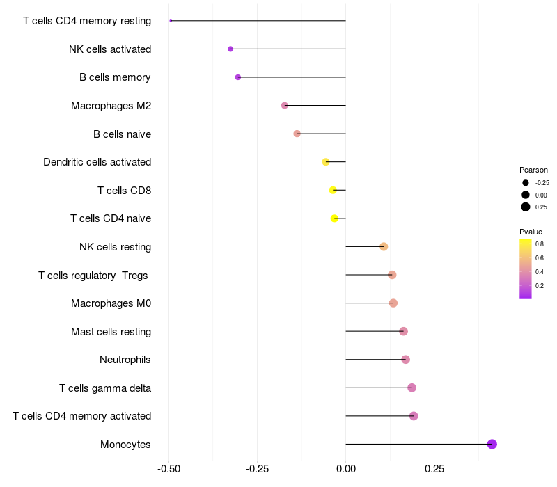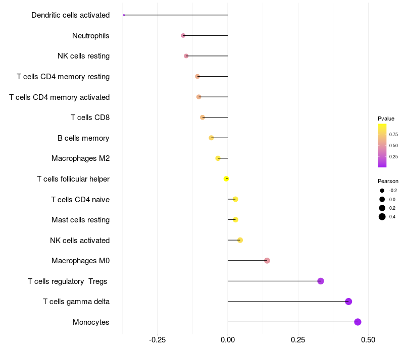 Lollipop of FHOD1 expression and immune infiltrating cell level correlation result in HTLV1+ samples