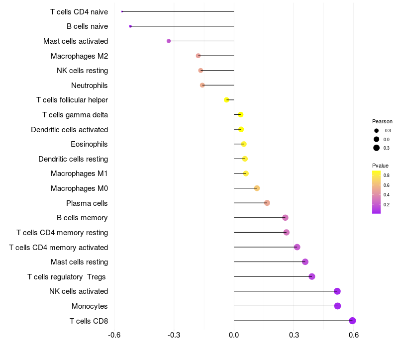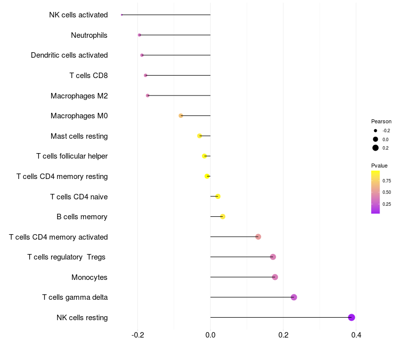 Lollipop of FKBP1B expression and immune infiltrating cell level correlation result in HTLV1+ samples