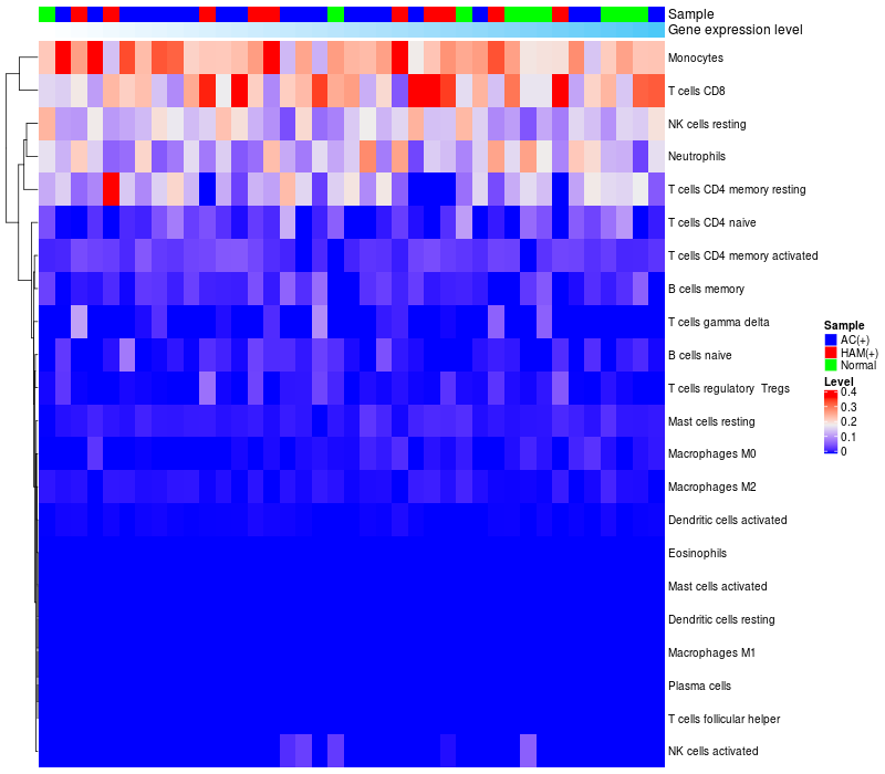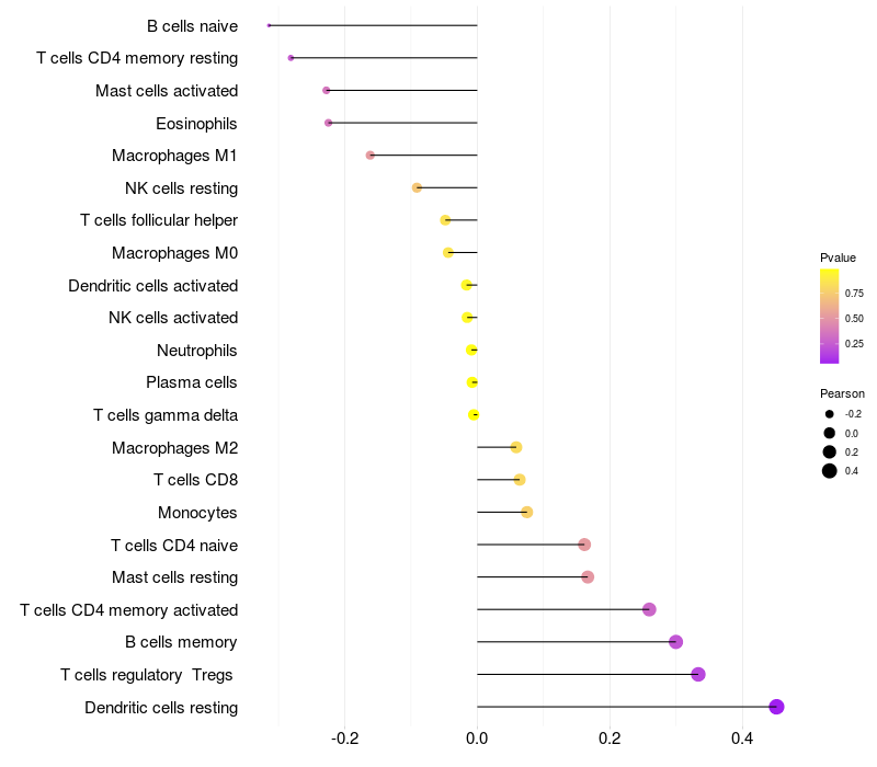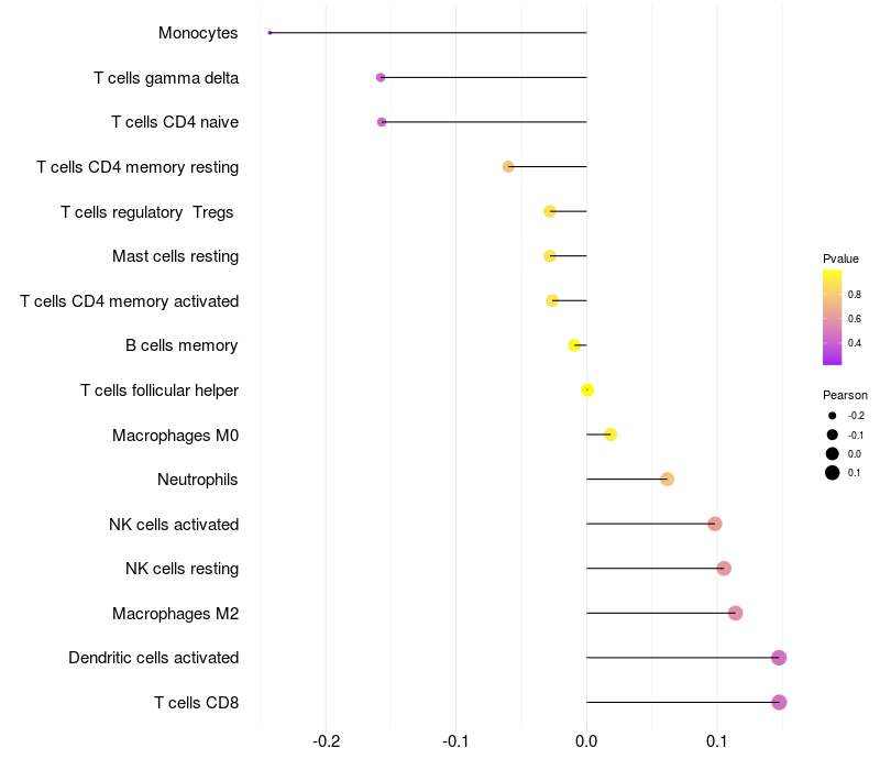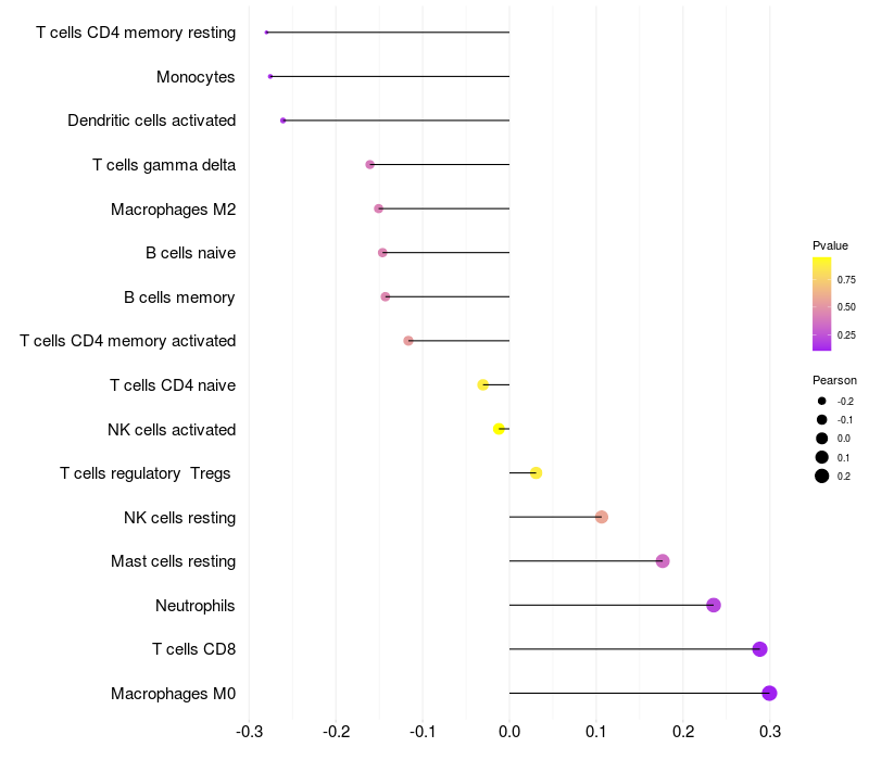 Lollipop of FKBP6 expression and immune infiltrating cell level correlation result in HTLV1+ samples