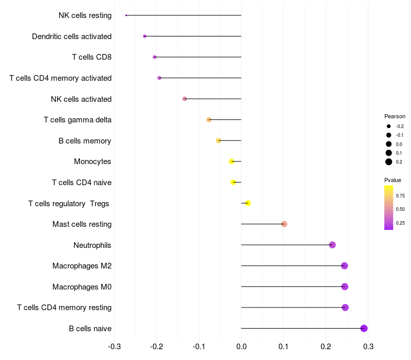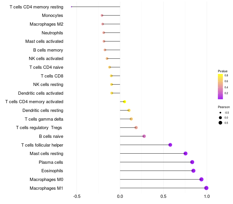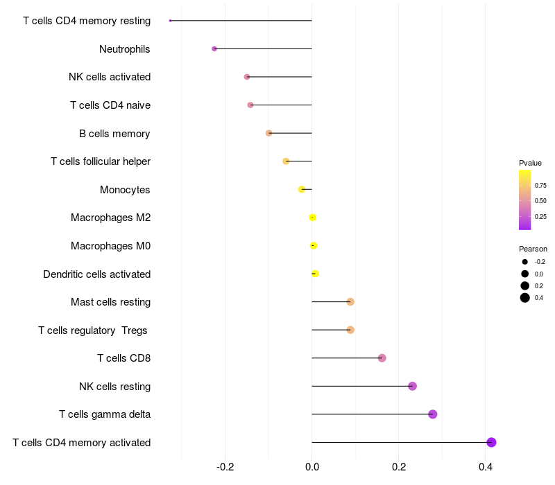 Lollipop of FLNC expression and immune infiltrating cell level correlation result in HTLV1+ samples