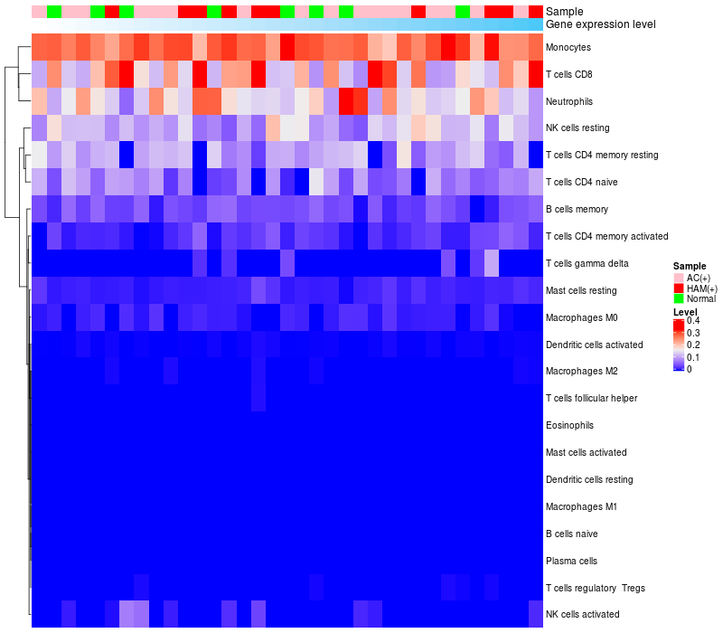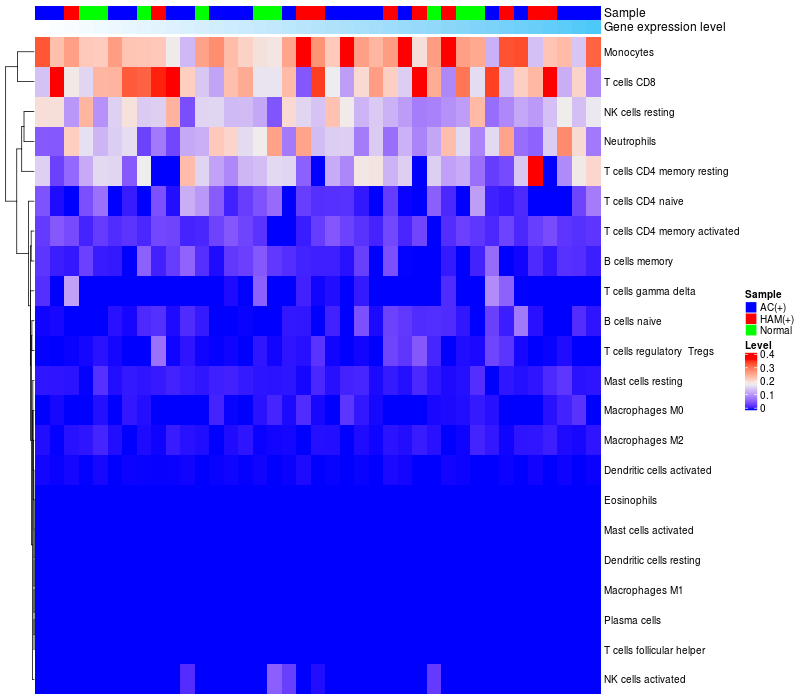 Normal (8), Asymptomatic carriers (HTLV1+)(17), HTLV-1-associated myelopathy (HTLV1+)(10) |