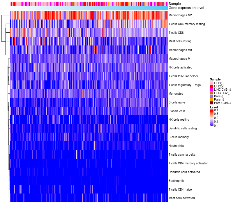 Liver hepatocellular carcinoma HCV (HBV+)(86), Liver hepatocellular carcinoma HCV (HBV-)(19), Liver hepatocellular carcinoma (HBV+)(209), Liver hepatocellular carcinoma (HBV+)(60), Paracancerous HCV (HBV+)(4), Paracancerous (HBV-)(28), Paracancerous (HBV+)(18) |