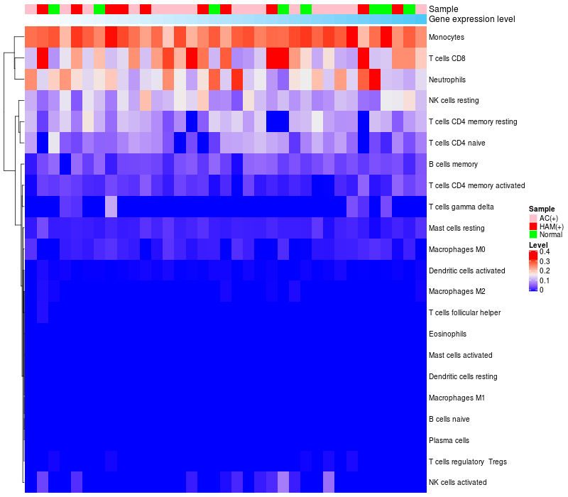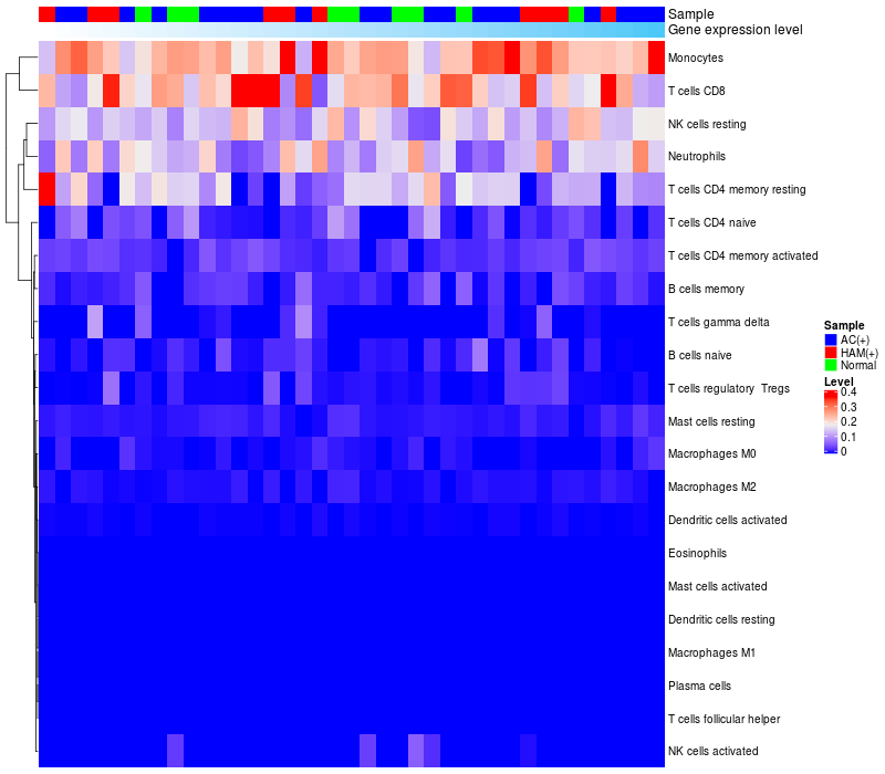 Normal (8), Asymptomatic carriers (HTLV1+)(17), HTLV-1-associated myelopathy (HTLV1+)(10) |