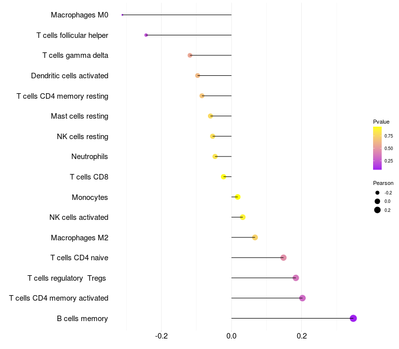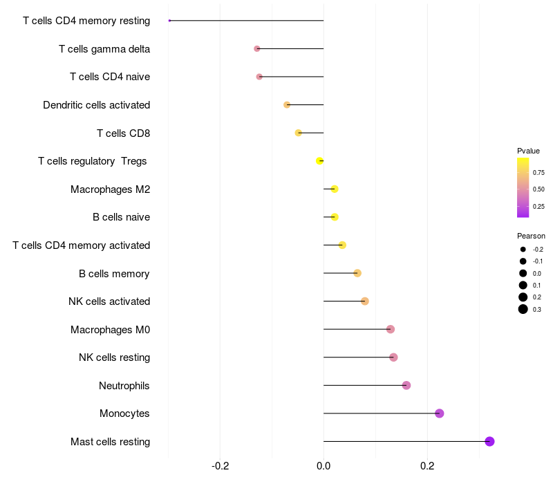 Lollipop of FLT3 expression and immune infiltrating cell level correlation result in HTLV1+ samples