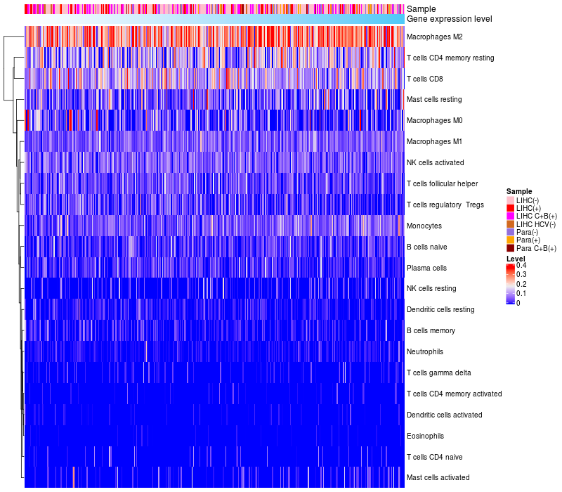 Liver hepatocellular carcinoma HCV (HBV+)(86), Liver hepatocellular carcinoma HCV (HBV-)(19), Liver hepatocellular carcinoma (HBV+)(209), Liver hepatocellular carcinoma (HBV+)(60), Paracancerous HCV (HBV+)(4), Paracancerous (HBV-)(28), Paracancerous (HBV+)(18) |