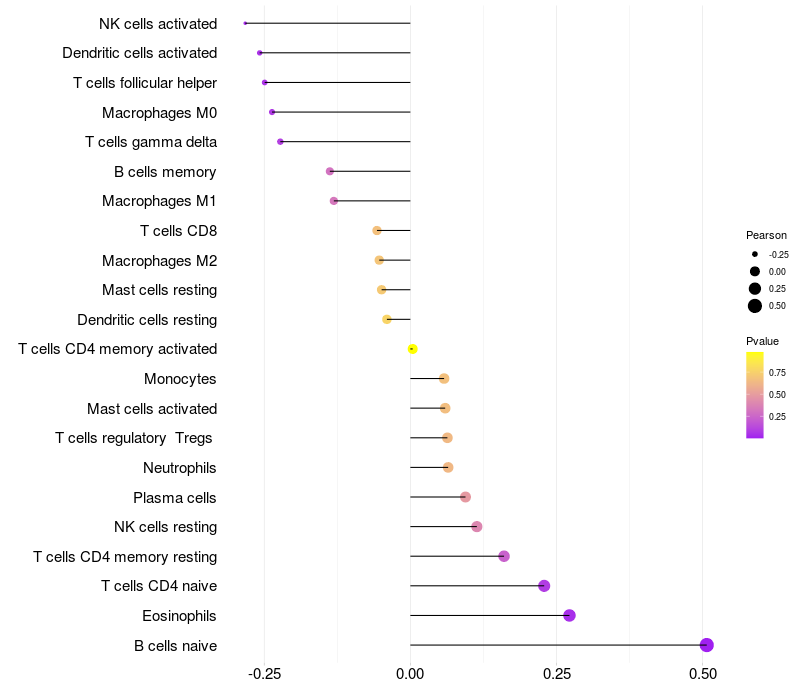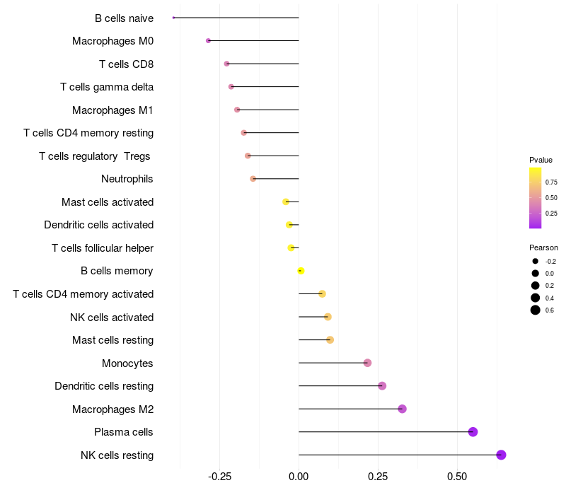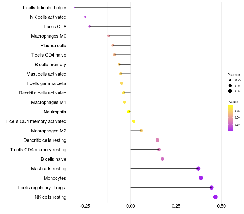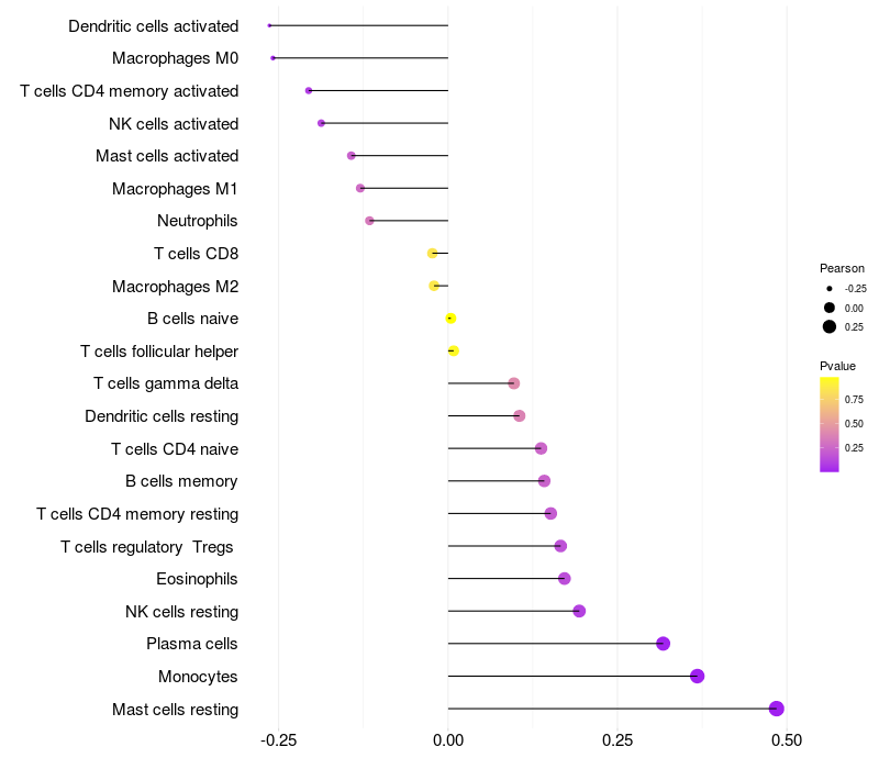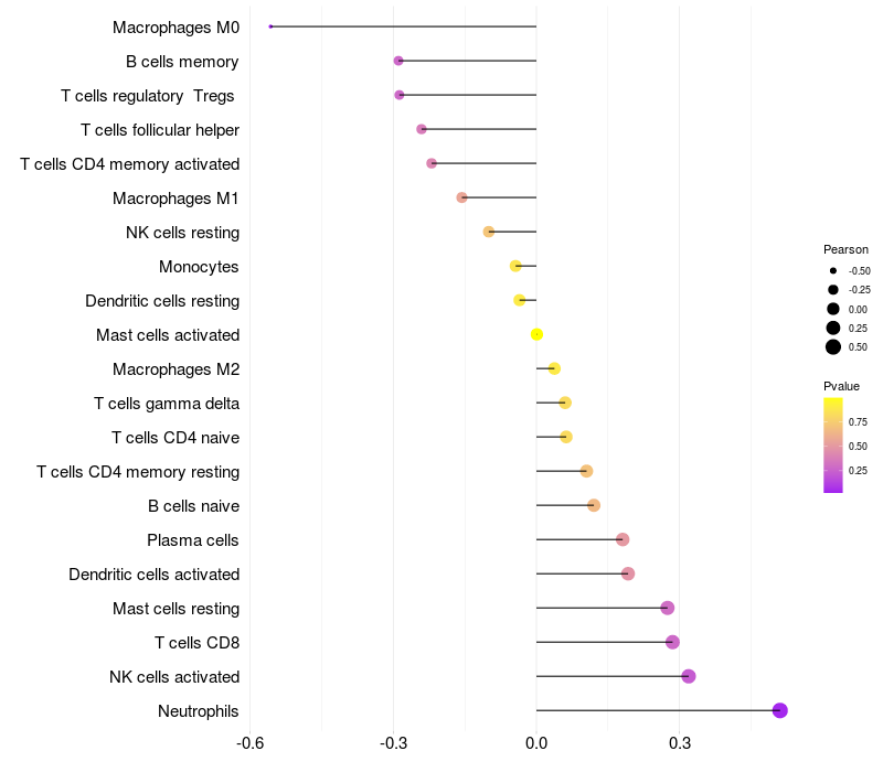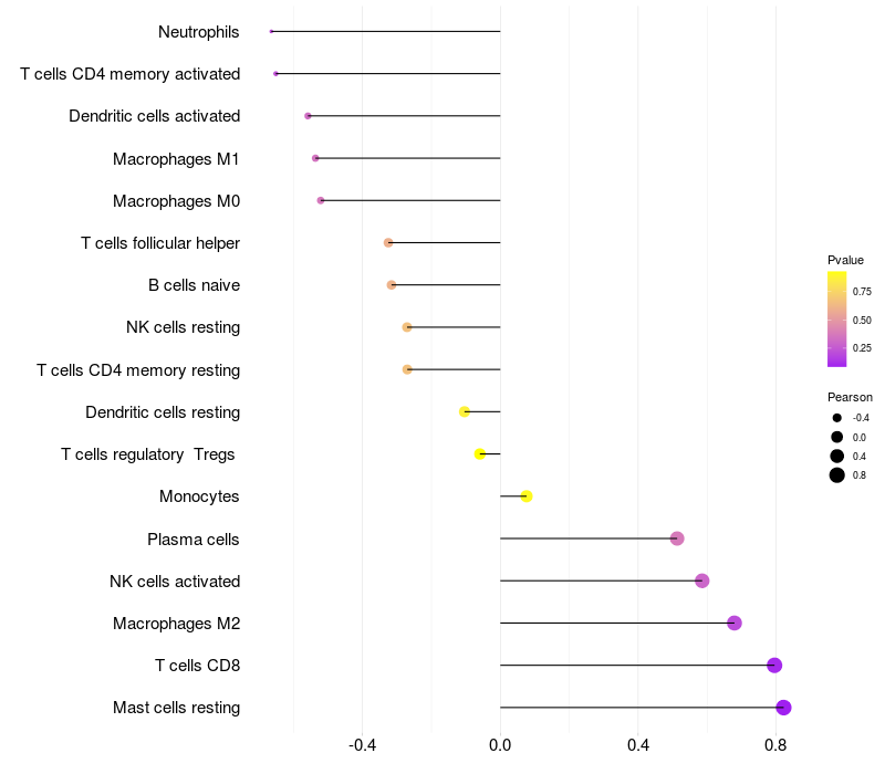 Lollipop of FMO2 expression and immune infiltrating cell level correlation result in HPV+ samples