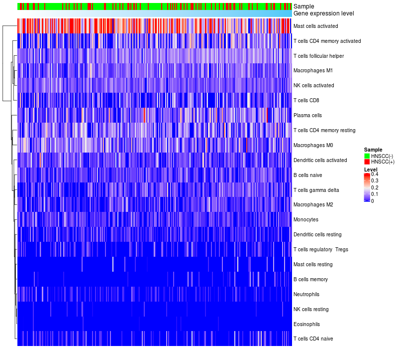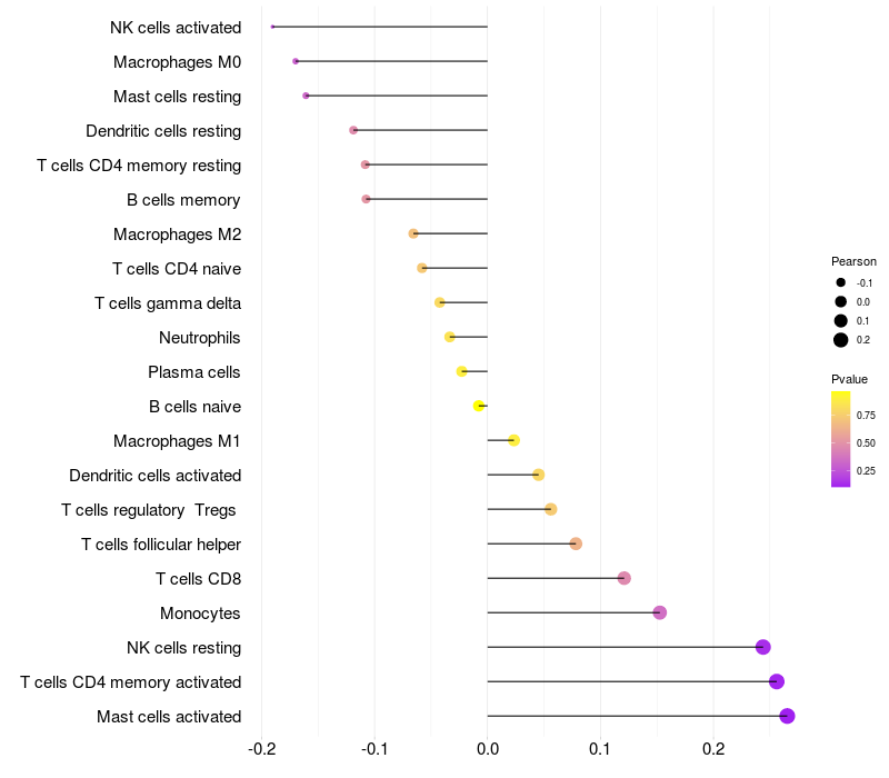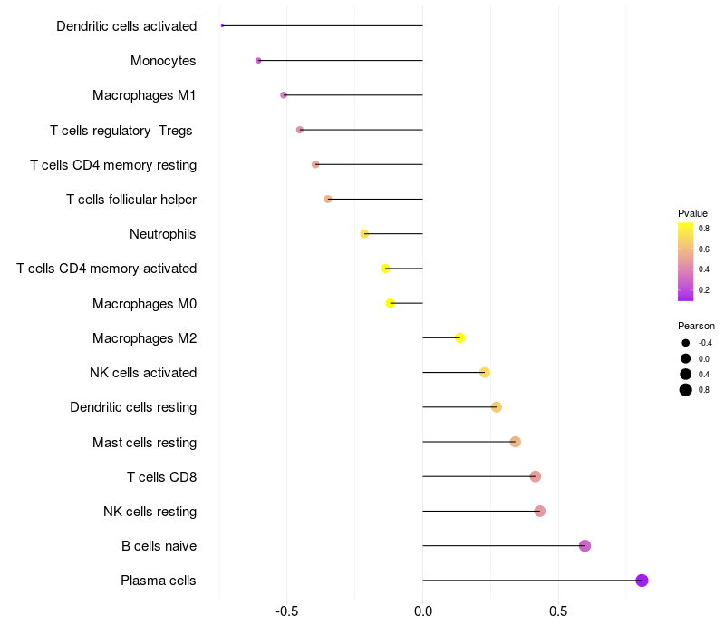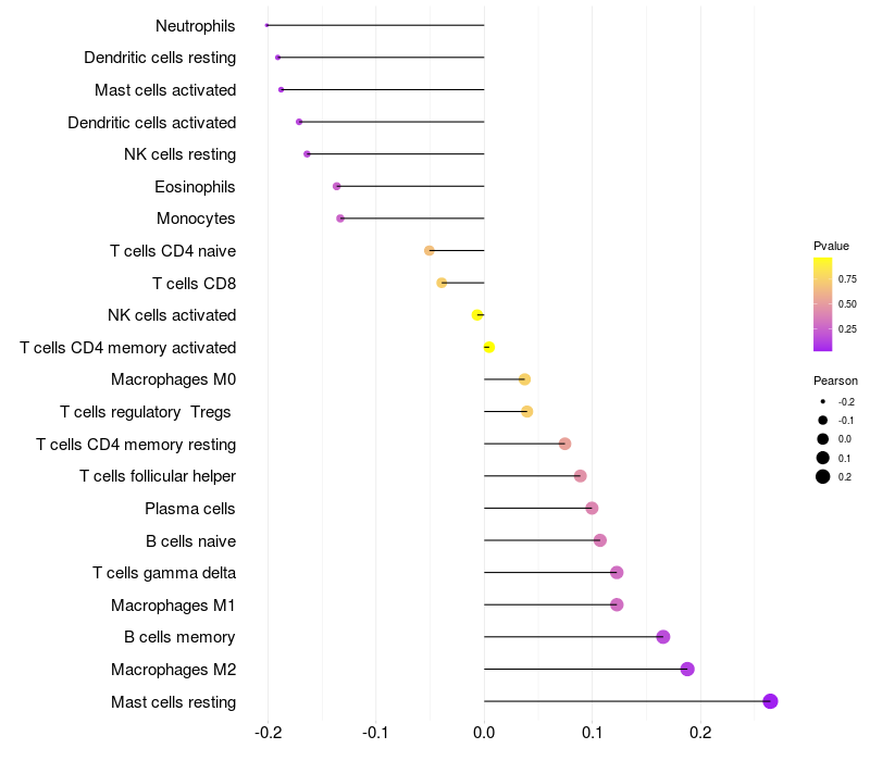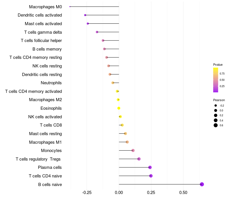 Lollipop of FMO3 expression and immune infiltrating cell level correlation result in HPV+ samples
