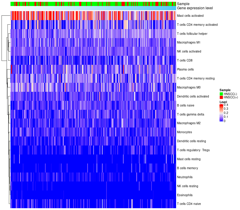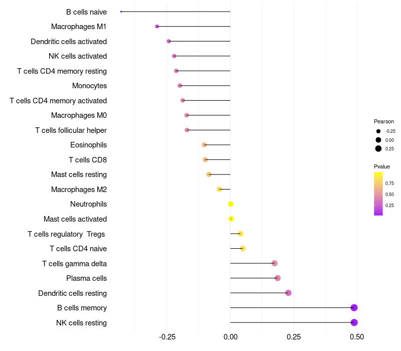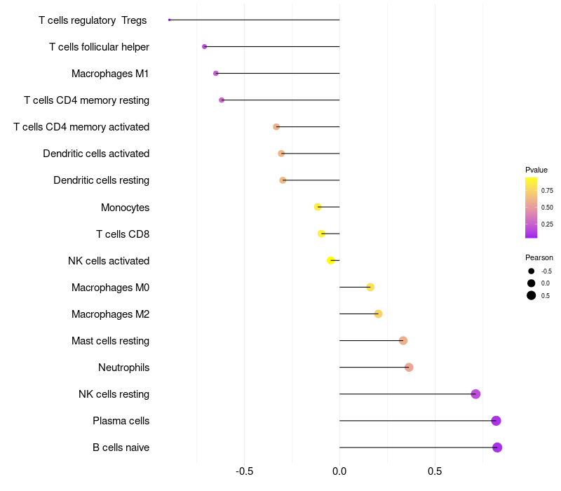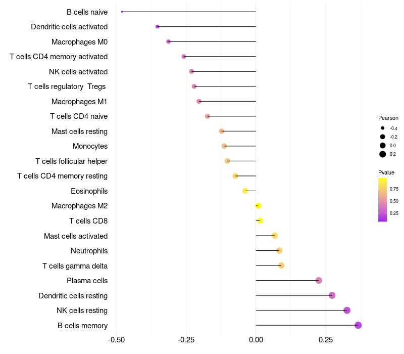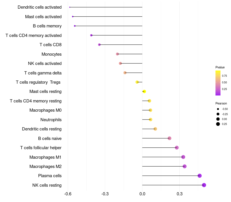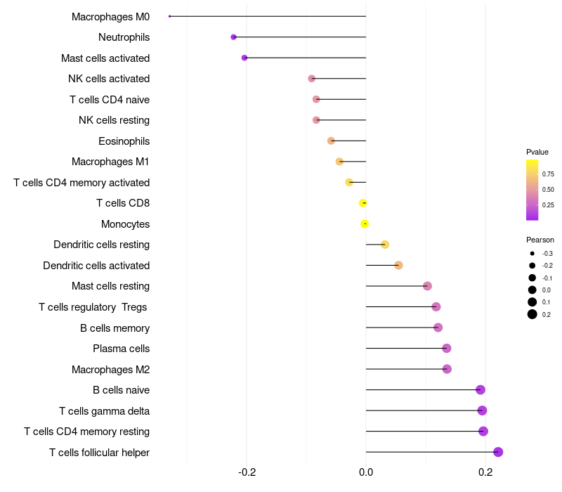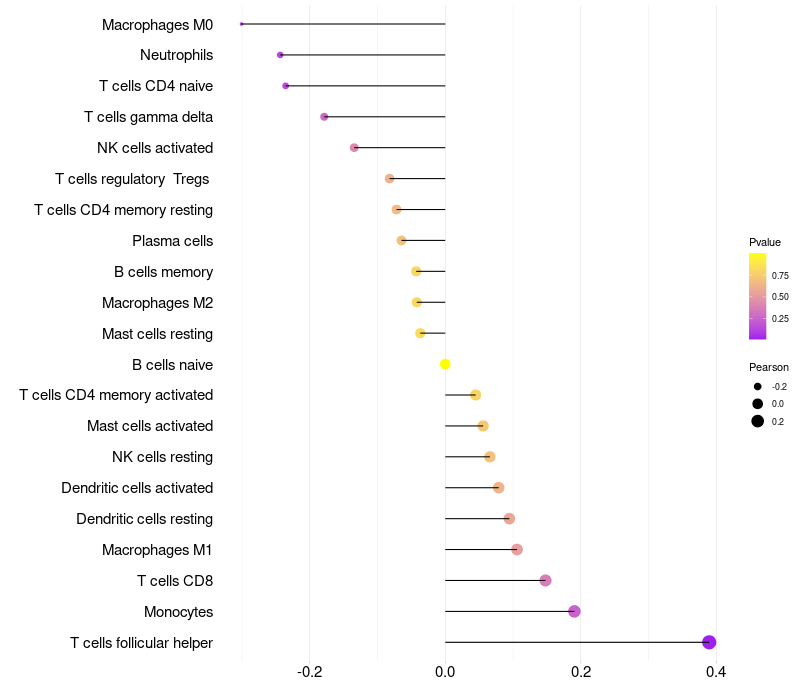 Lollipop of FMO4 expression and immune infiltrating cell level correlation result in HPV+ samples