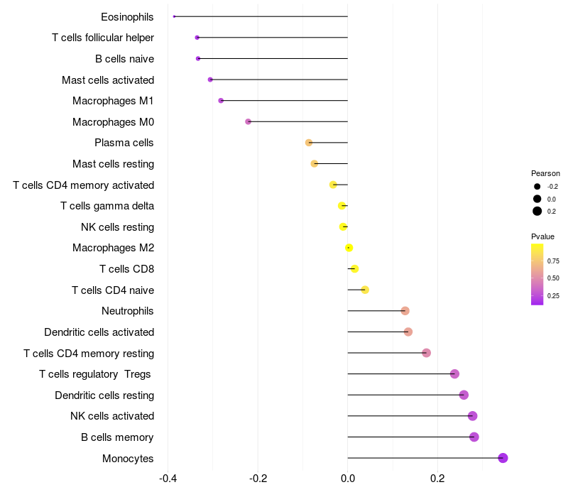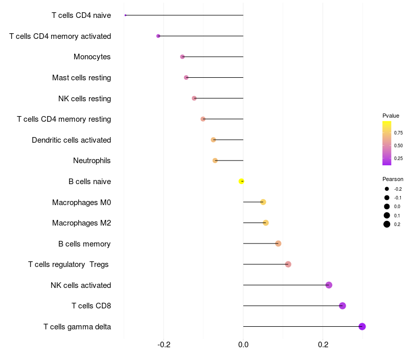 Lollipop of FMO6P expression and immune infiltrating cell level correlation result in HTLV1+ samples
