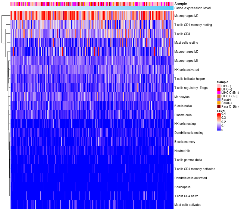 Liver hepatocellular carcinoma HCV (HBV+)(86), Liver hepatocellular carcinoma HCV (HBV-)(19), Liver hepatocellular carcinoma (HBV+)(209), Liver hepatocellular carcinoma (HBV+)(60), Paracancerous HCV (HBV+)(4), Paracancerous (HBV-)(28), Paracancerous (HBV+)(18) |
