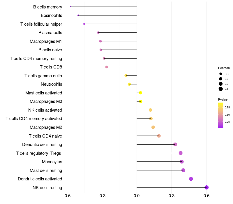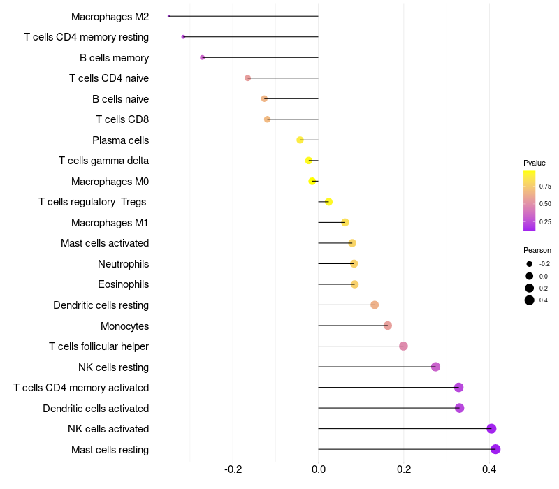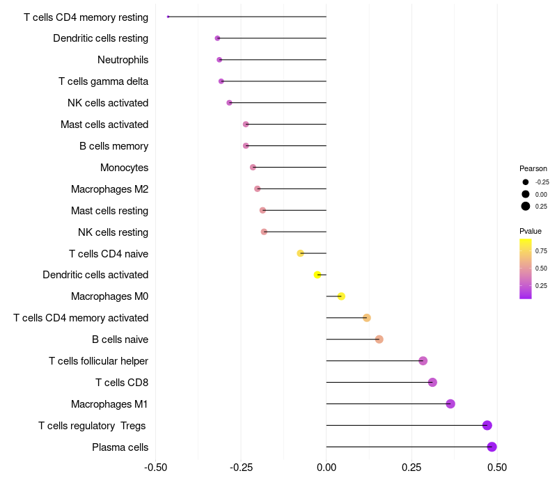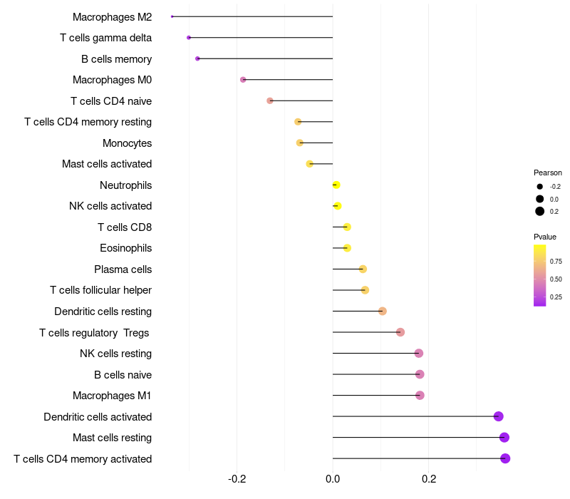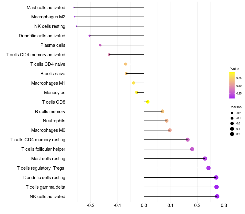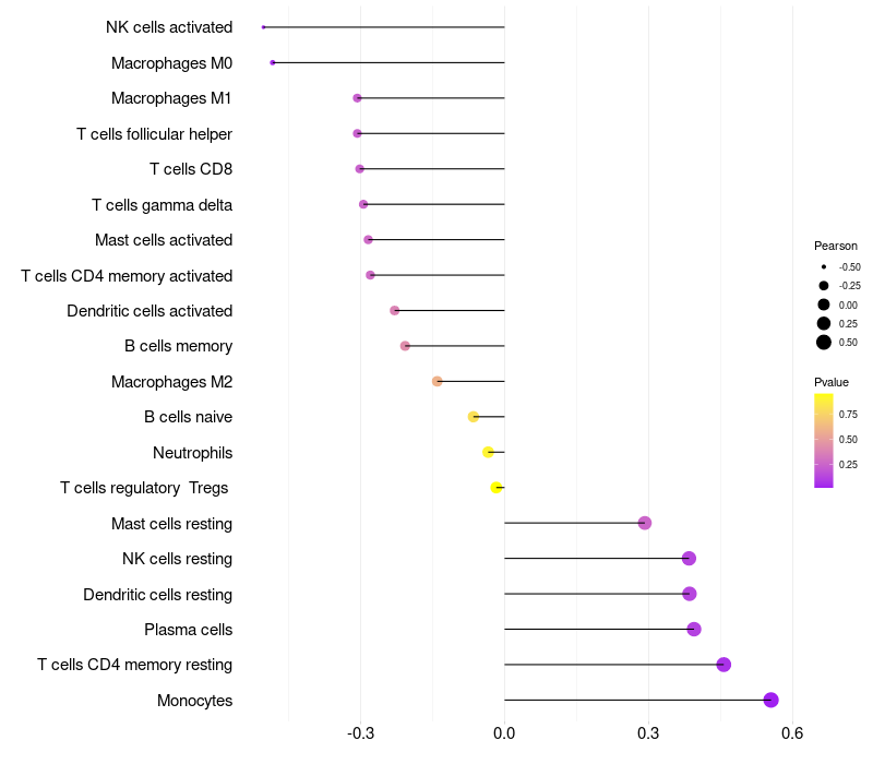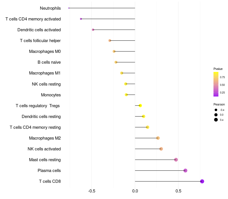 Lollipop of FOXN1 expression and immune infiltrating cell level correlation result in HPV+ samples