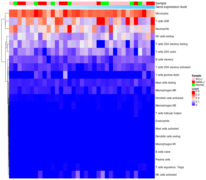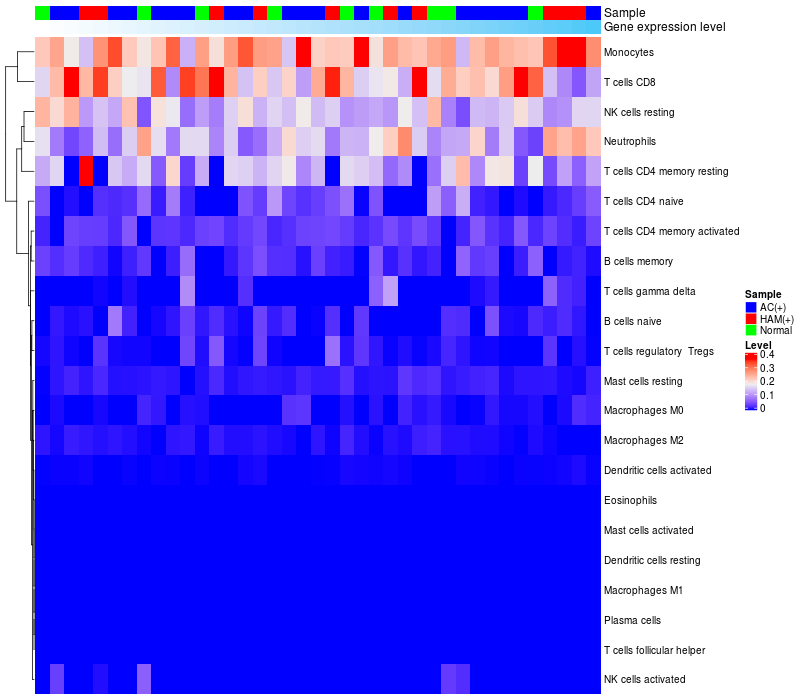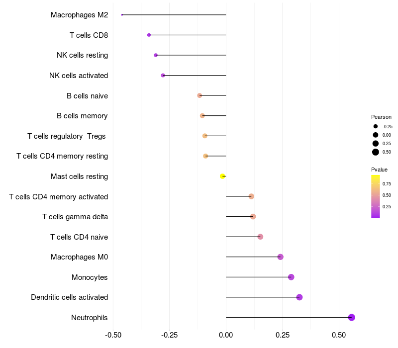 Lollipop of FREM3 expression and immune infiltrating cell level correlation result in HTLV1+ samples