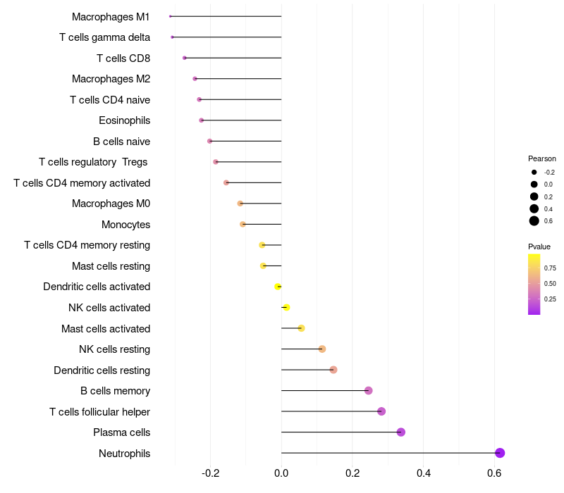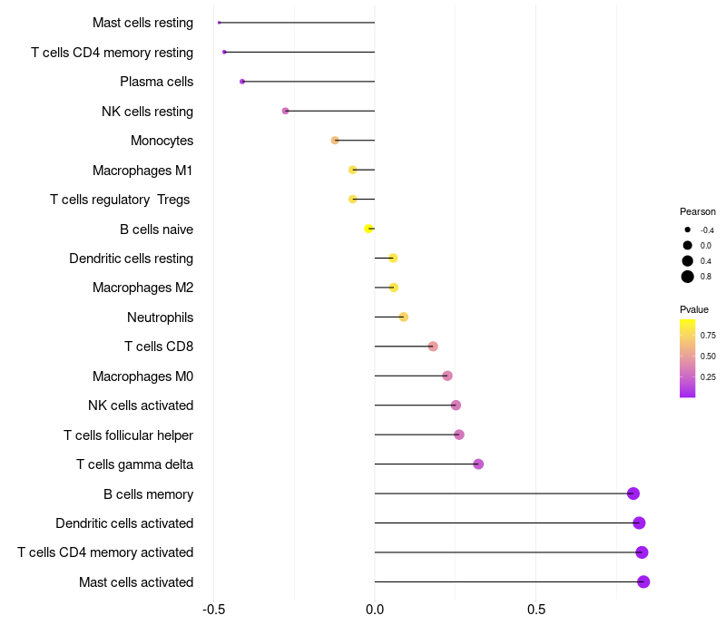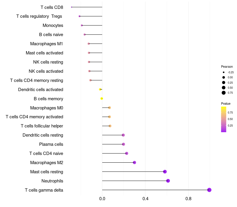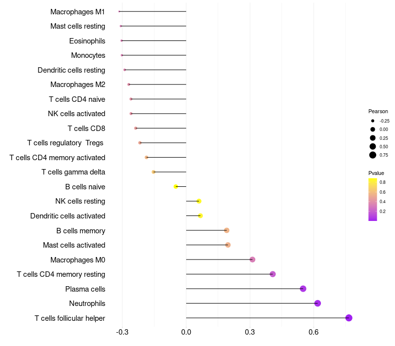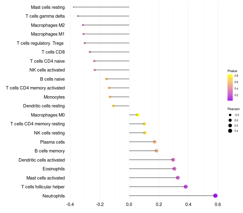 Lollipop of FRG2B expression and immune infiltrating cell level correlation result in HPV+ samples