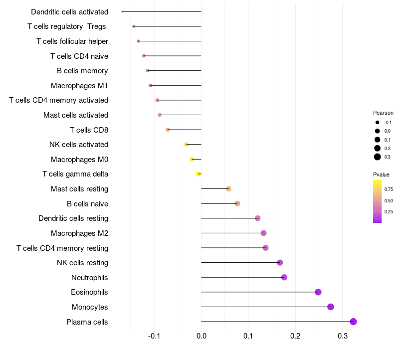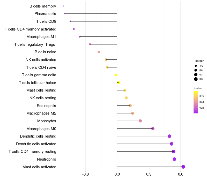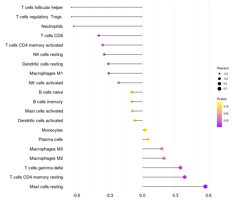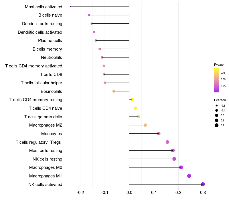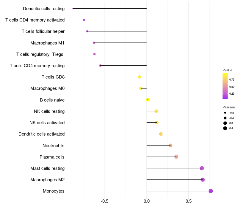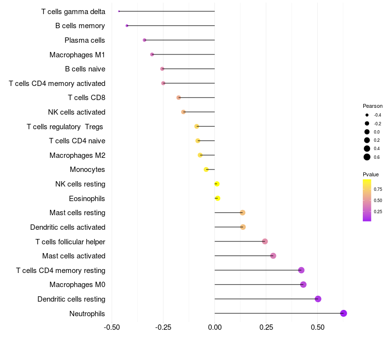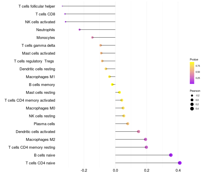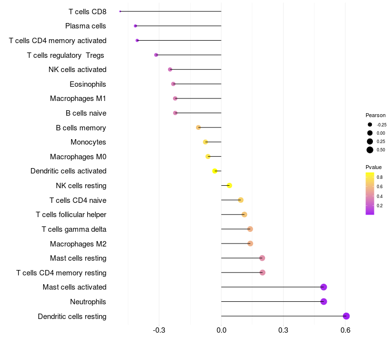 Lollipop of FRMD3 expression and immune infiltrating cell level correlation result in HPV+ samples