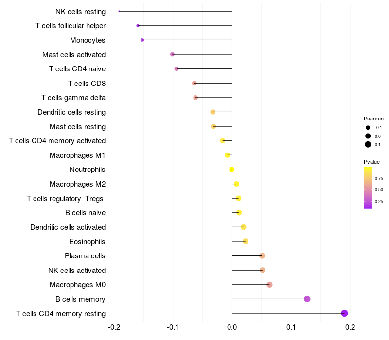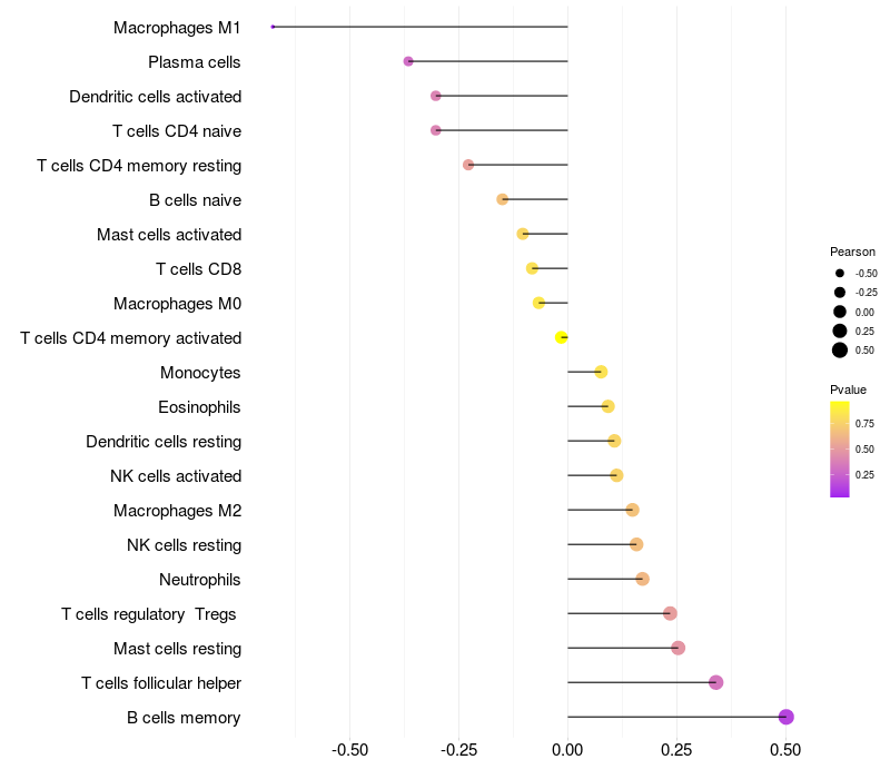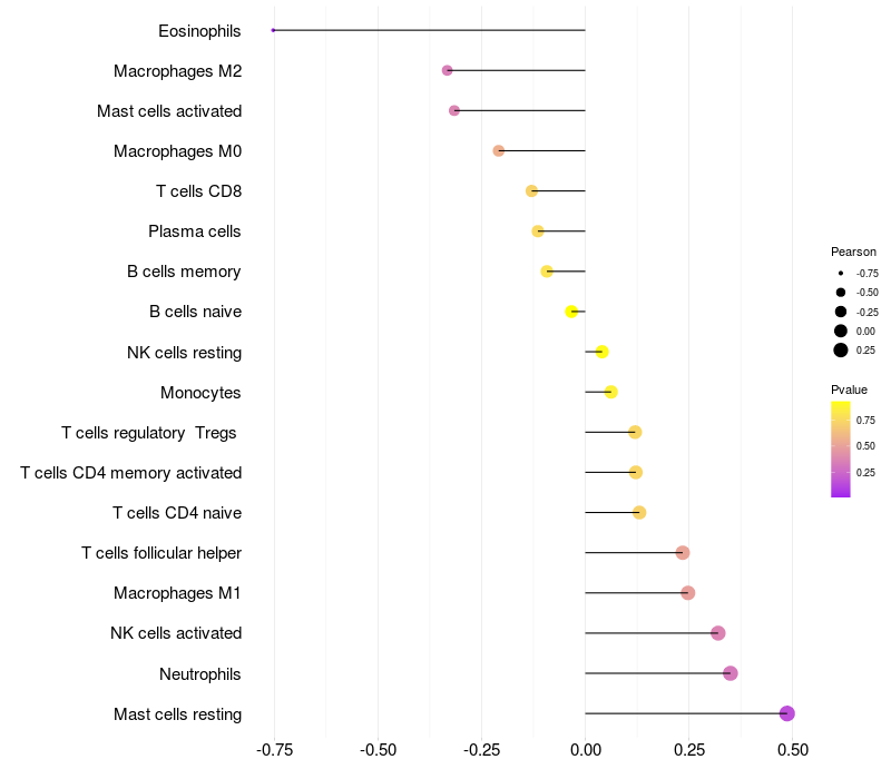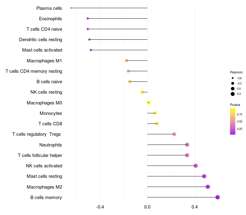 Lollipop of FRYL expression and immune infiltrating cell level correlation result in HBV+ Liver cirrhosis samples