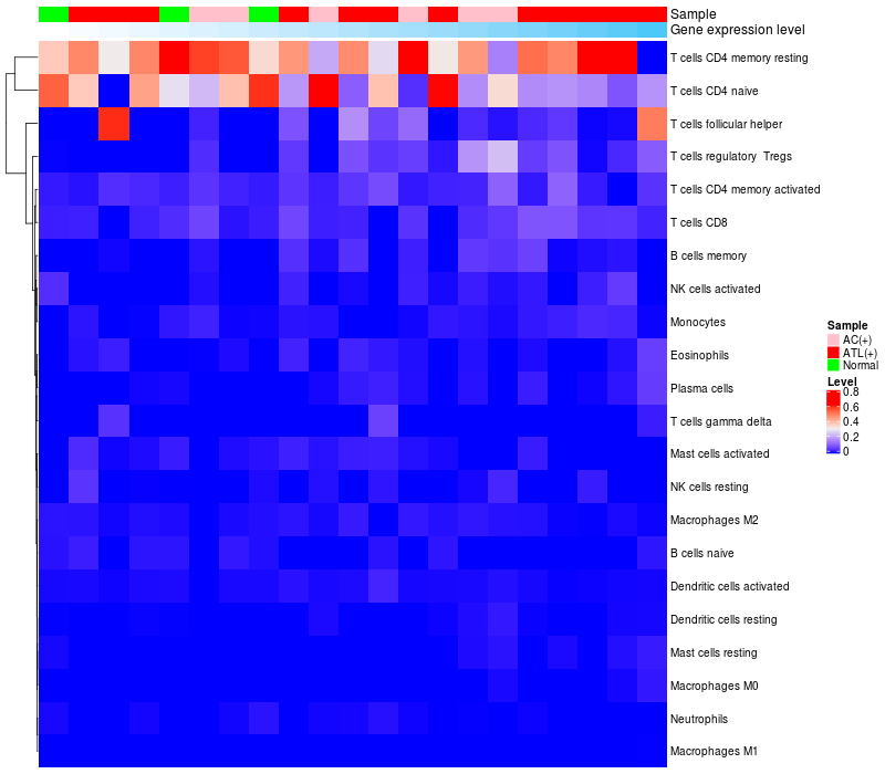• Left: Heatmap of target gene expression and the level of various types of immune cells (cell type fractions) in all samples based on CIBERSORT method.