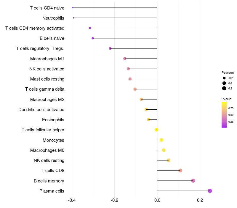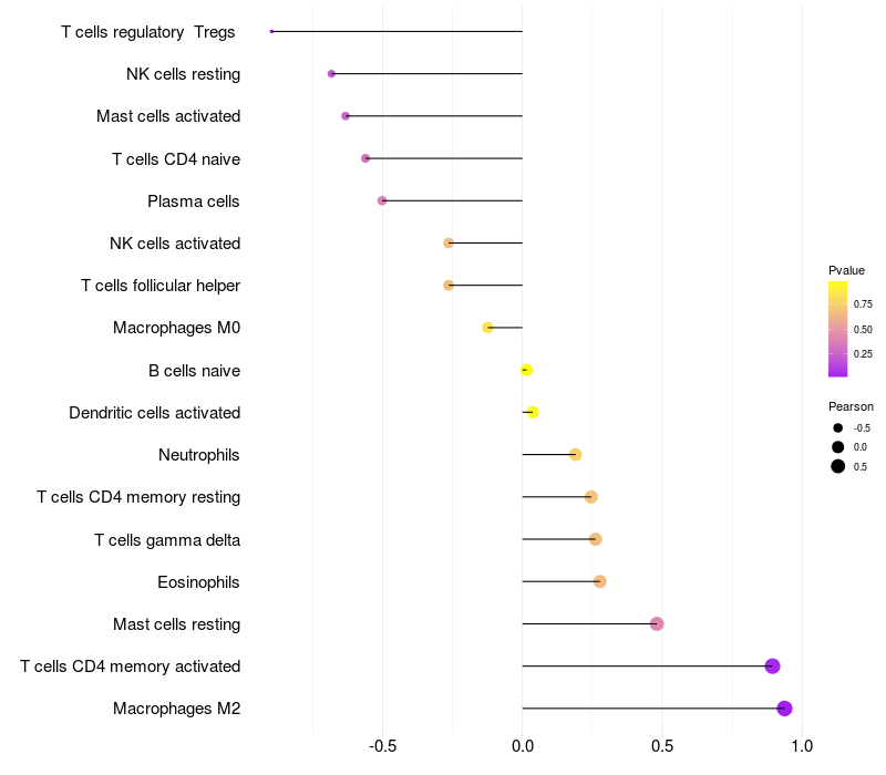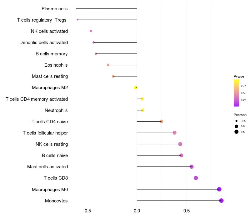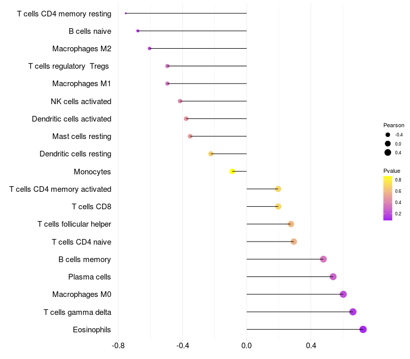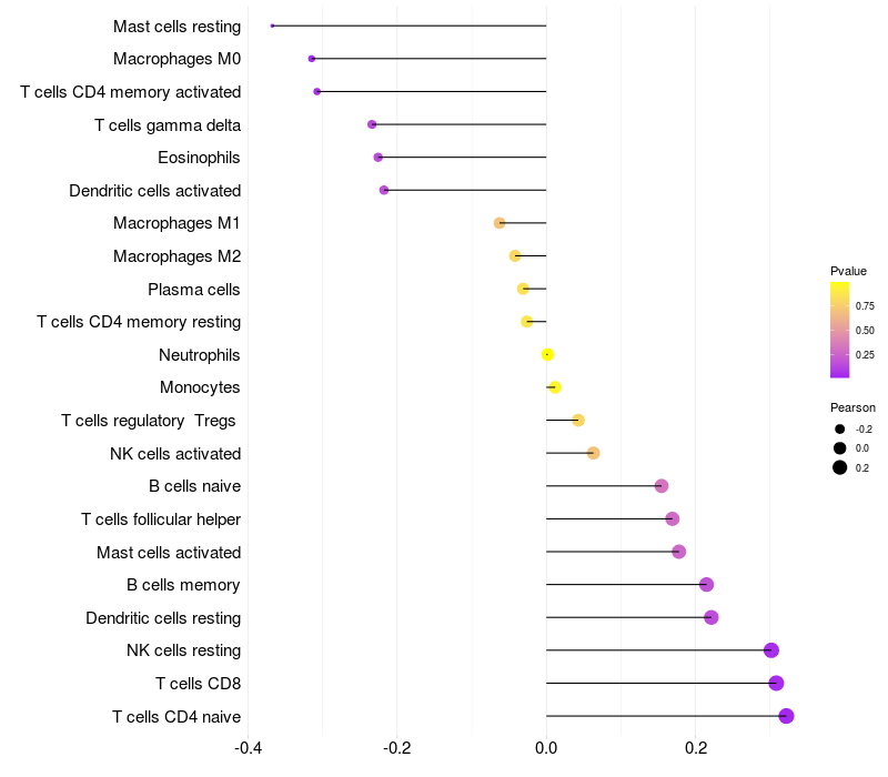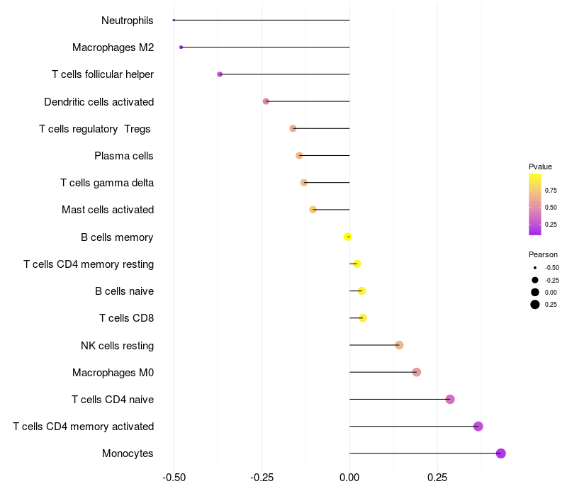 Lollipop of FTCD expression and immune infiltrating cell level correlation result in EBV+ samples