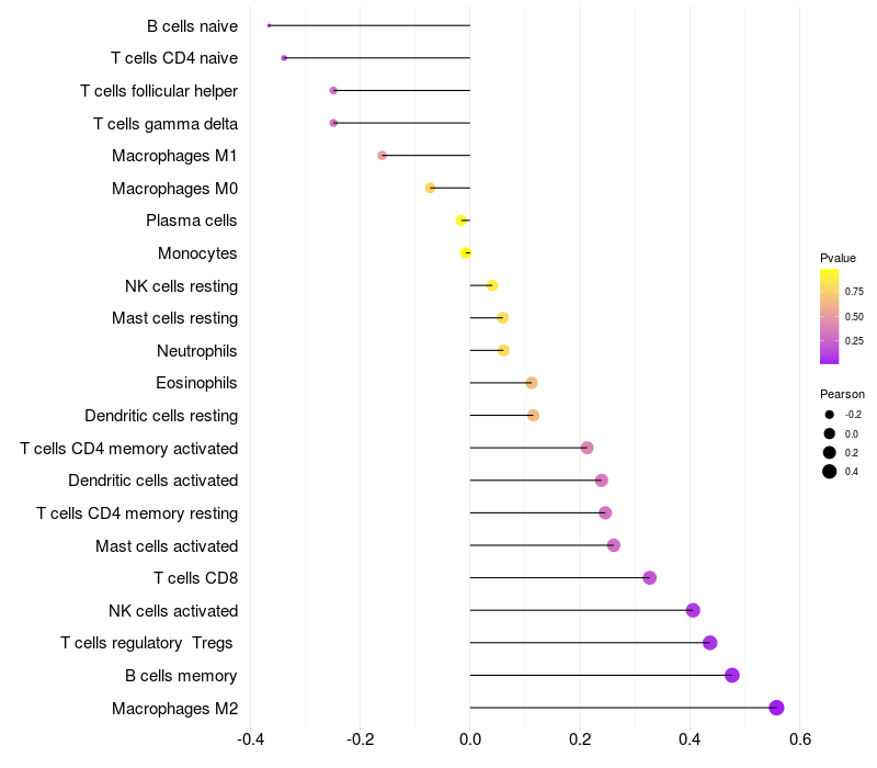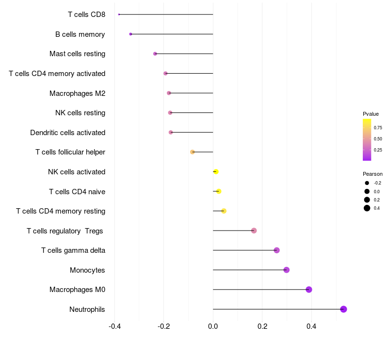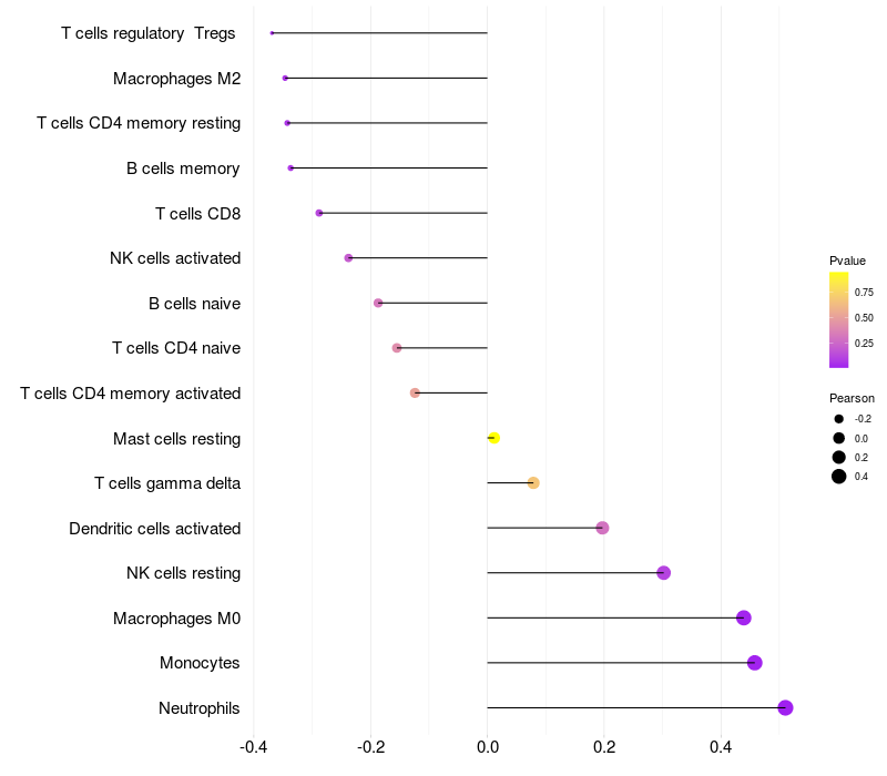 Lollipop of FTH1 expression and immune infiltrating cell level correlation result in HTLV1+ samples