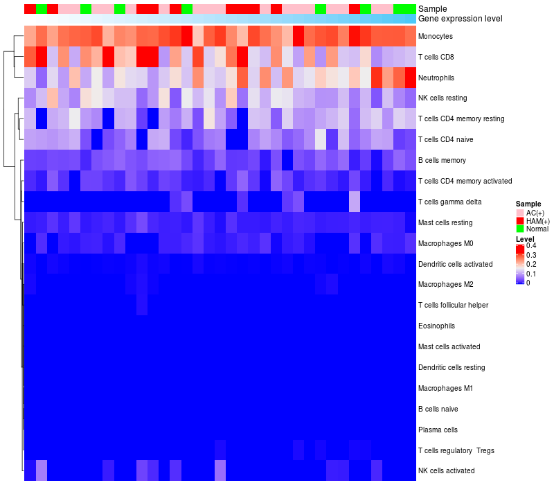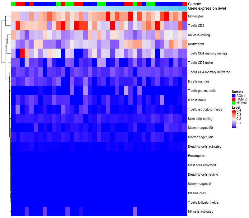 Normal (8), Asymptomatic carriers (HTLV1+)(17), HTLV-1-associated myelopathy (HTLV1+)(10) |