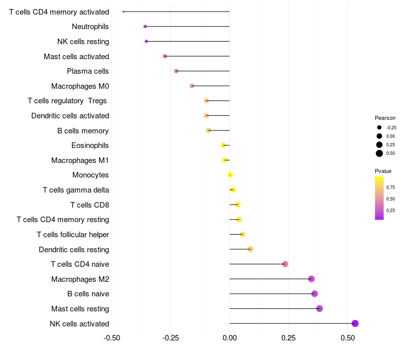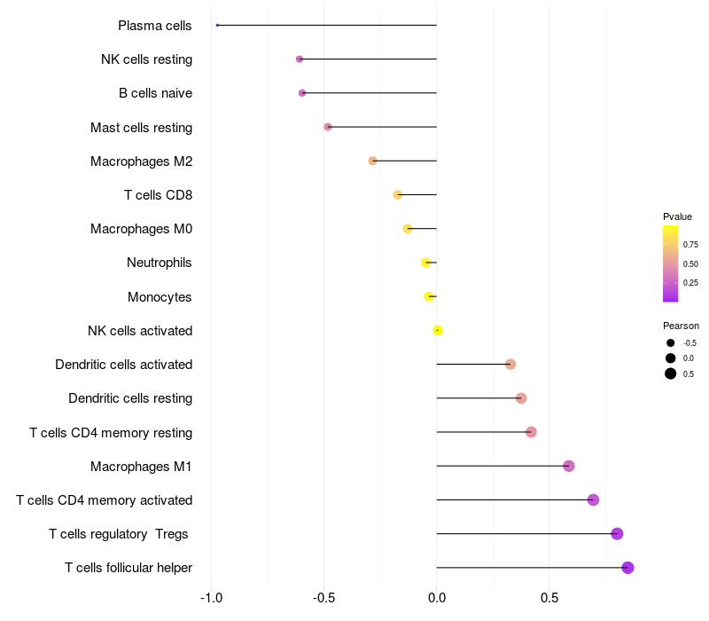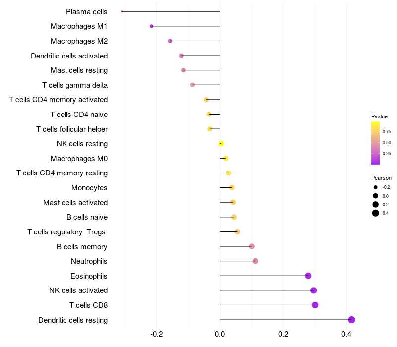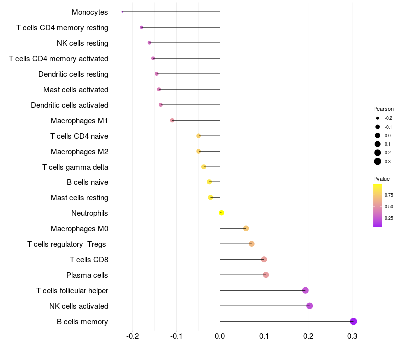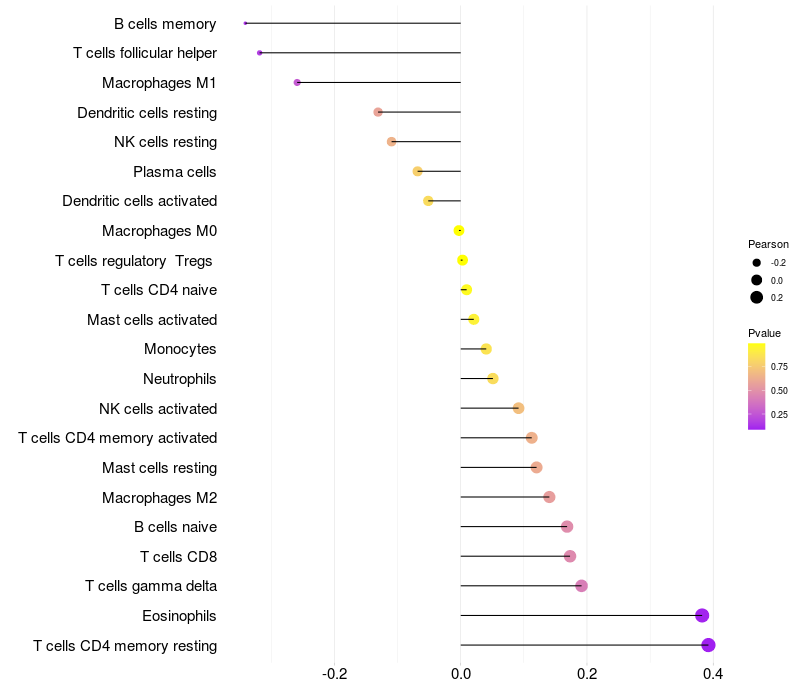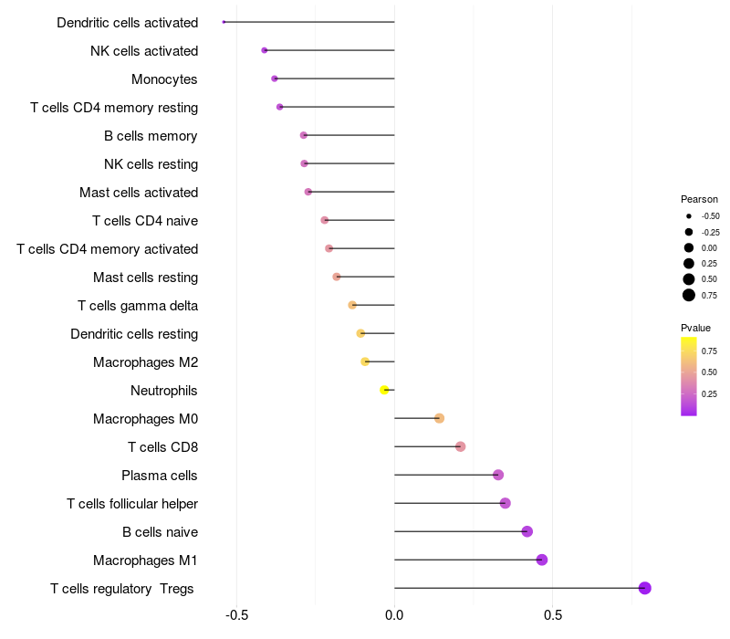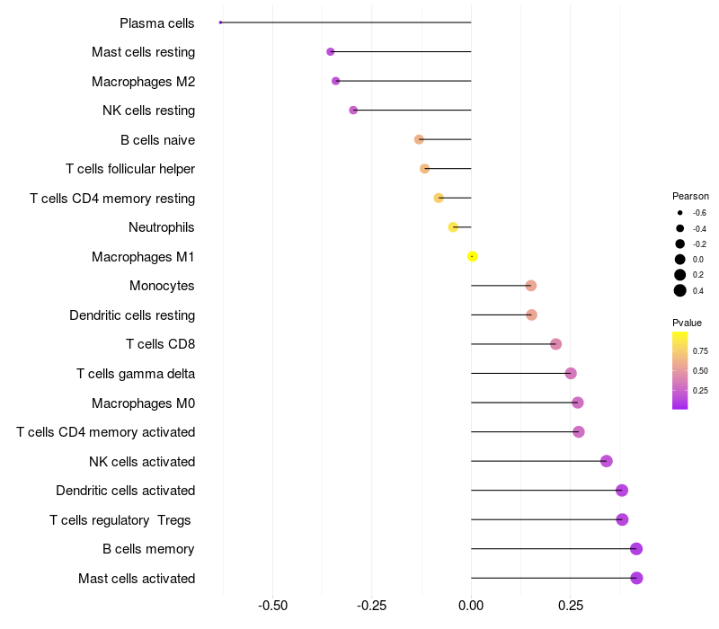 Lollipop of FTMT expression and immune infiltrating cell level correlation result in HPV+ samples