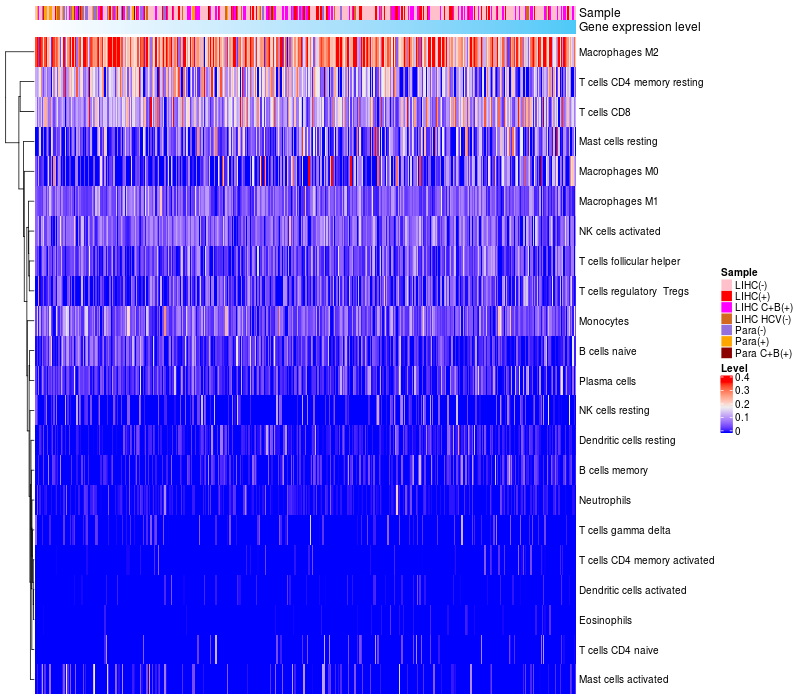 Liver hepatocellular carcinoma HCV (HBV+)(86), Liver hepatocellular carcinoma HCV (HBV-)(19), Liver hepatocellular carcinoma (HBV+)(209), Liver hepatocellular carcinoma (HBV+)(60), Paracancerous HCV (HBV+)(4), Paracancerous (HBV-)(28), Paracancerous (HBV+)(18) |